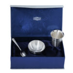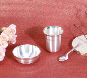 A perfect silver set of glass, bowl and spoon for your home. Use it for dining, dessert, pooja or your kids. It is an elegant silver set. It is definitely a luxurious gift and return gift on any occasion.