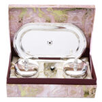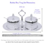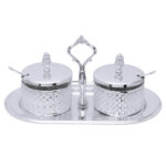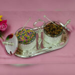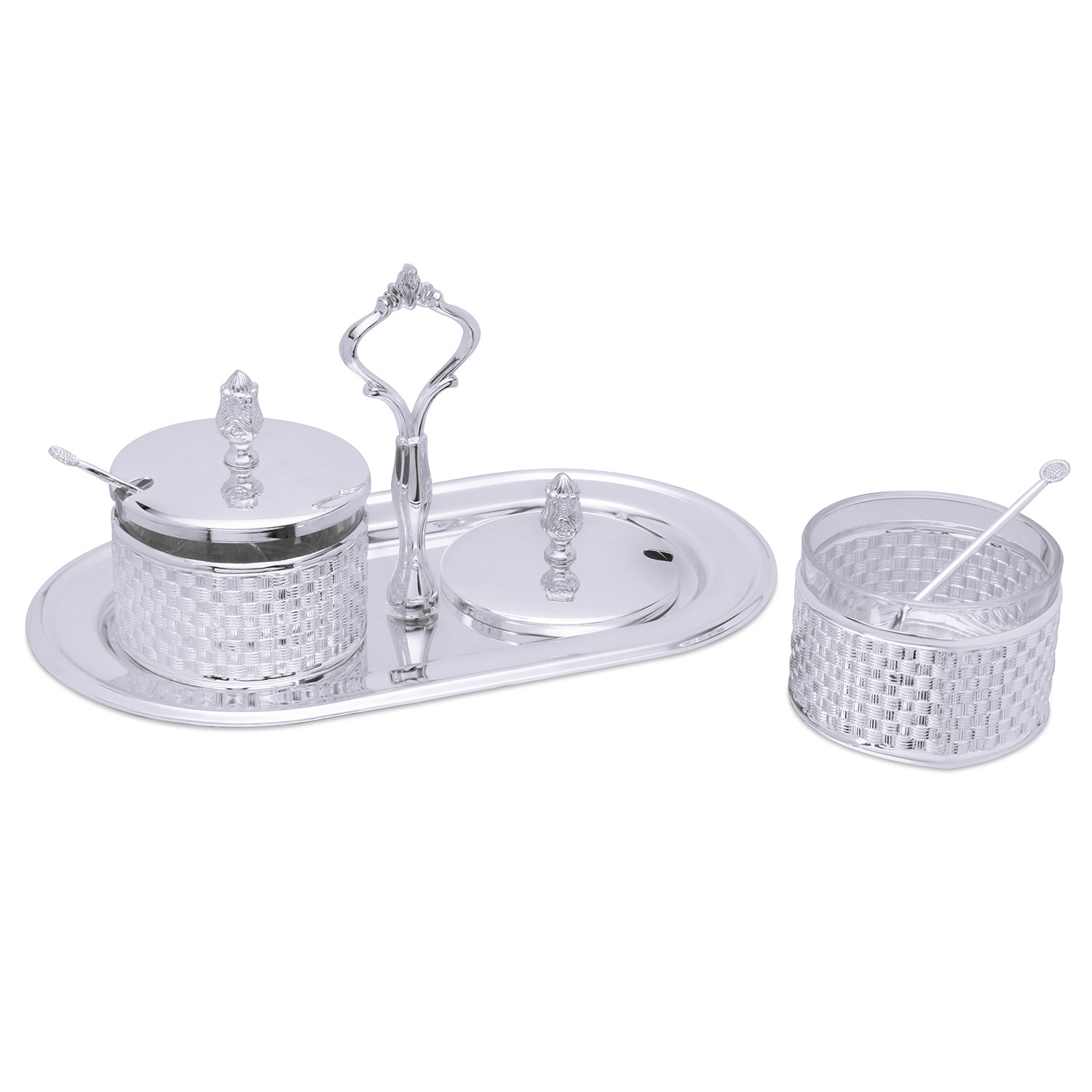 Elevate your dining experience with our versatile silver plated jar set with a tray stand. This multipurpose serveware set includes two jars with lids, two spoons, and a stylish tray, all elegantly silver plated. You can use it to serve dry fruits, condiments or mothfresheners while dining. This set adds a touch of sophistication to your table. The silver plating not only enhances its aesthetic appeal but also ensures durability. Transform your dining decor and convenience with this beautiful and multipurpose set, a perfect addition to any home. Consider it as a thoughtful and perfect gift for your loved ones on their special occasions.