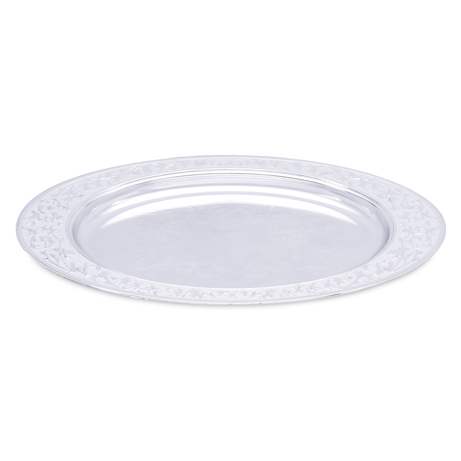 This beautiful silver plated serveware is very intricately designed. The jars have a detailed etching all around. The lid has a glossy finish with a charming carved knob to hold it and a cutout for keeping the spoon properly in the jar. The spoons have a cute round design at the end. The tray stand has shiny glossy finish overall with a beautifully carved handle to hold the set.