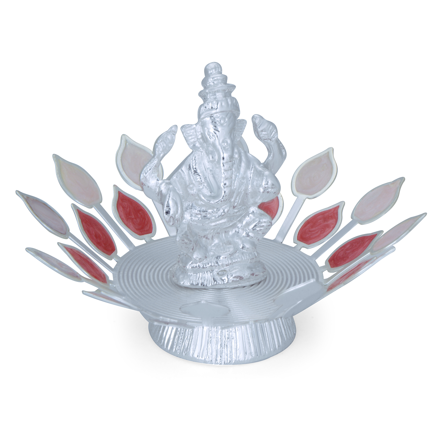 Enhance your spiritual space with this elegant Ganesh statue. This beautifully crafted idol features Lord Ganesha seated at the center of a decorative base adorned with red and pink petal motifs. The vibrant enamel detailing combined with the silver-toned finish creates a striking and festive appearance. Lord Ganesha symbolizes wisdom, prosperity, and the removal of obstacles, making this idol a meaningful addition to your home temple, living room, office desk, or study area. The circular base with layered leaf design adds depth and artistic charm, blending traditional spirituality with modern decorative style.