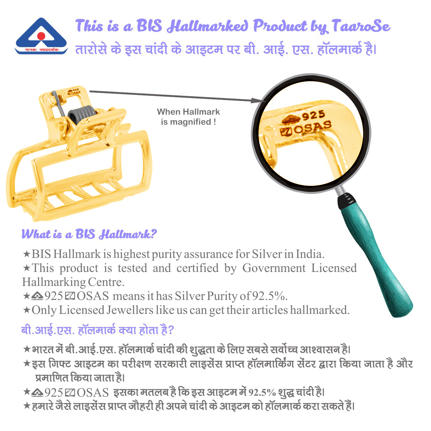 Taarose by Osasbazaar 925 Sterling Silver Hair Clutcher in Rectangle shape – BIS Hallmarked: