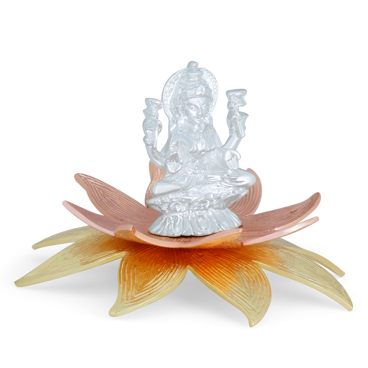 The Laxmi Idol is intricately designed with a serene facial expression and finely detailed ornaments, reflecting traditional craftsmanship. The goddess is seated on a layered lotus flower base, featuring elegant petals in golden and rose gold shades that beautifully complement the silver plated idol.
