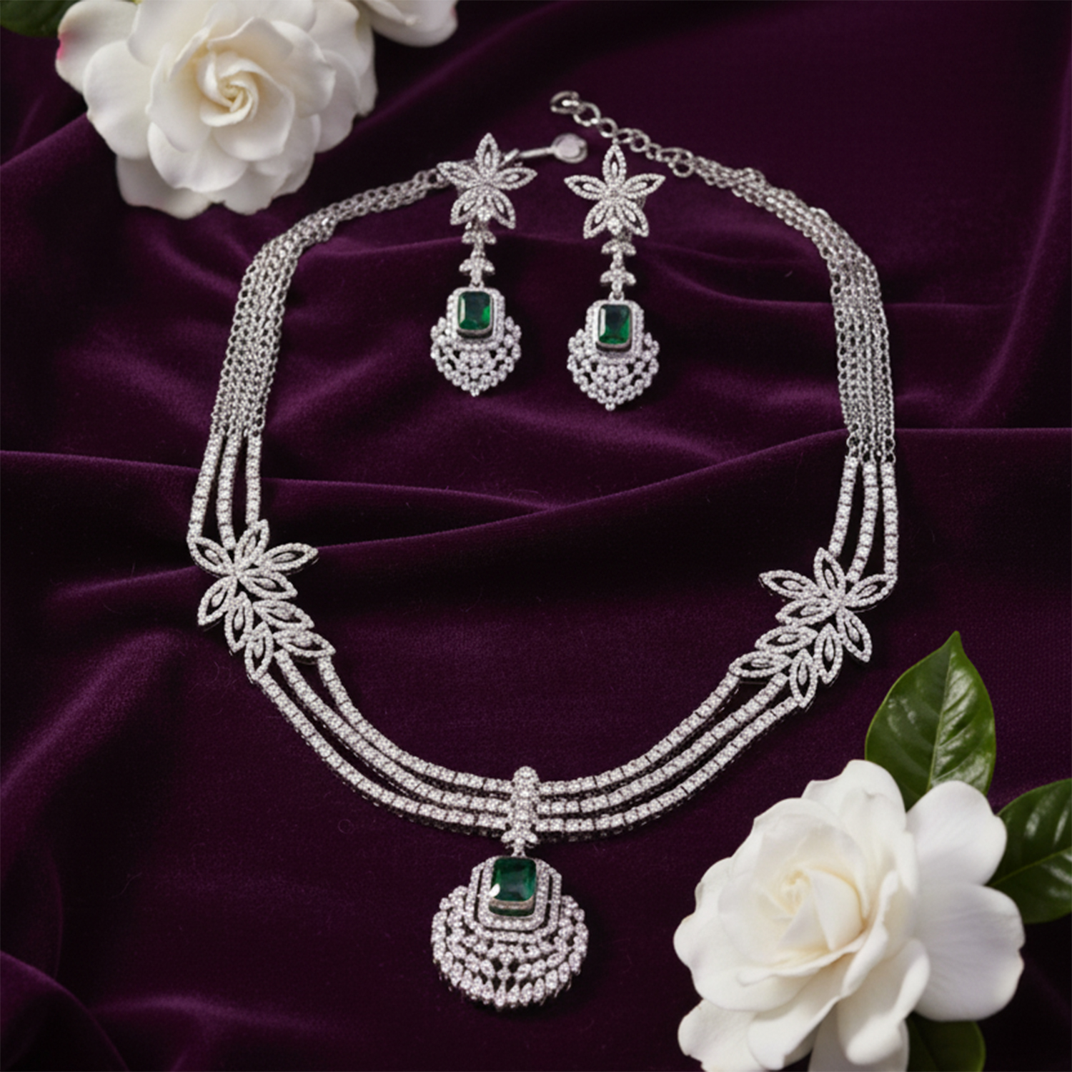 Sterling Silver Elegant Silver-Toned Bridal Jewelry Set with Emerald-Green Stones & Sparkling CZ Diamonds (Made to Order)