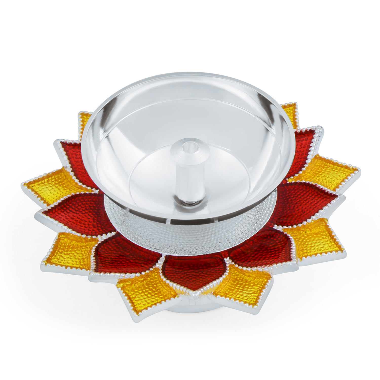 The Diya features a polished silver plated bowl at the center, encircled by a vibrant petal-inspired pattern in rich orange and red tones. The layered sunburst style design enhances its festive appeal while maintaining a traditional look.