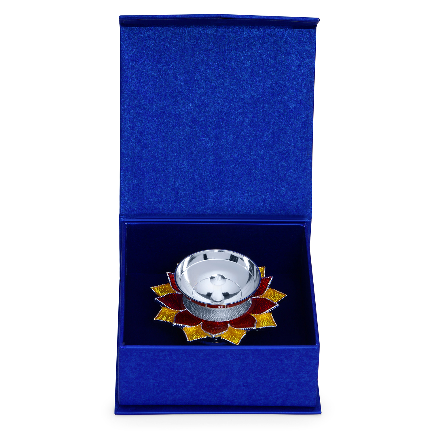 Bring light, positivity, and festive charm into your home with this Silver Plated deepak. Beautifully crafted with a lustrous silver plated bowl and surrounded by vibrant orange and red decorative elements, this diya blends traditional spirituality with elegant design. Ideal for daily pooja rituals, Diwali celebrations, Navratri, housewarming ceremonies and festive decor, this diya enhances the sacred ambiance of your mandir or living space. The colorful petal-style pattern around the diya adds a radiant and eye-catching appearance, making it suitable for both spiritual use and decorative display.