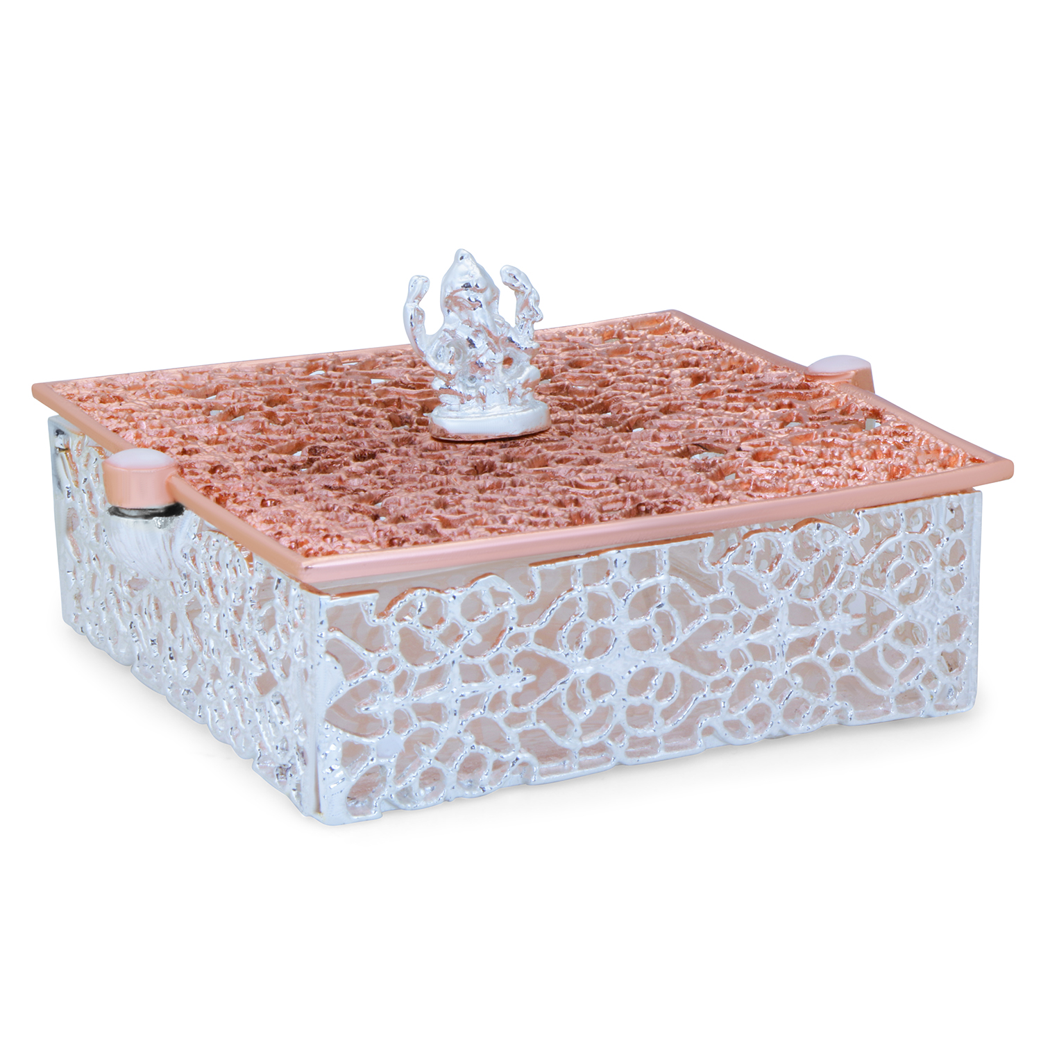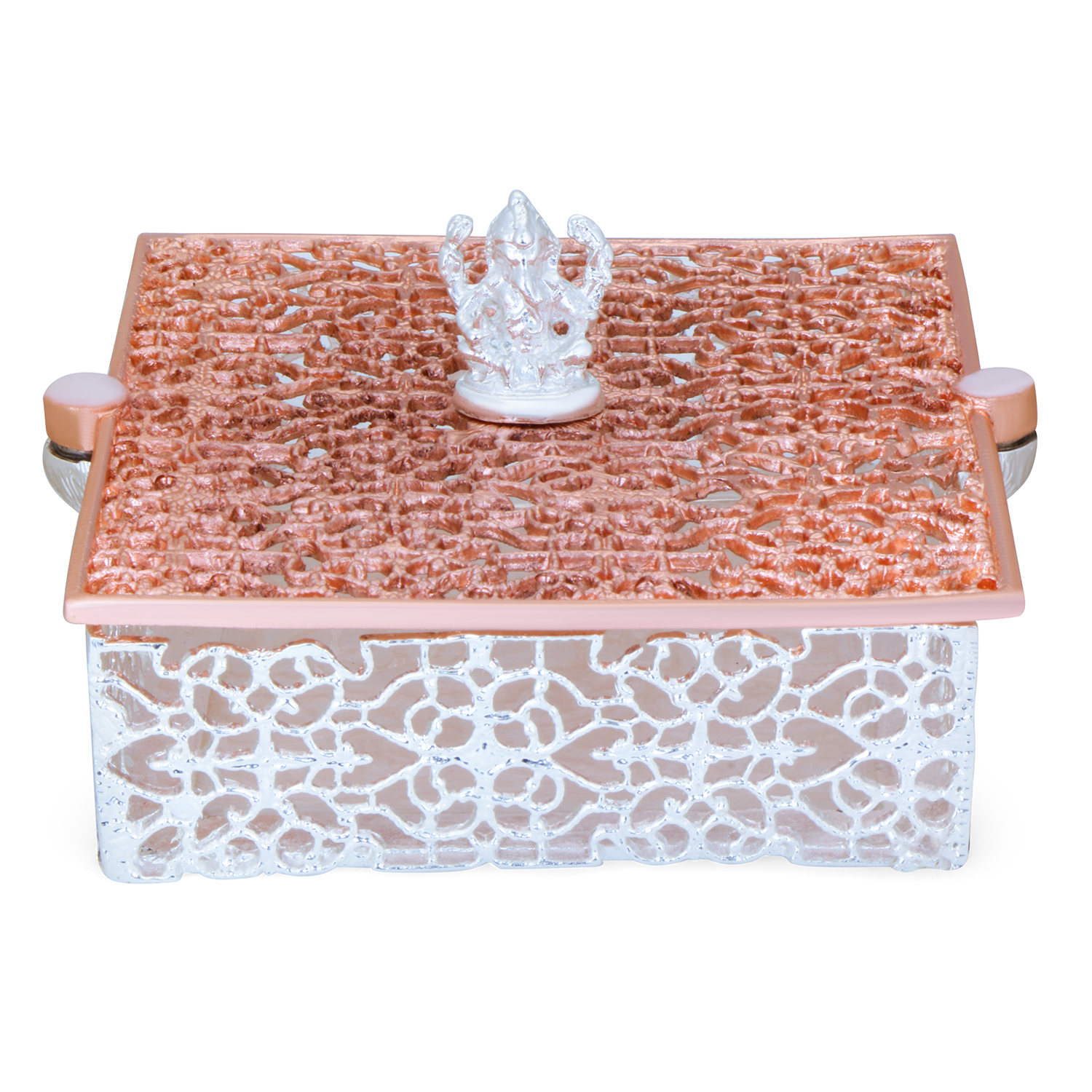 Add divine elegance to your home with this beautifully designed box. Crafted with a premium rose gold finish, this decorative piece features an intricately detailed Lord Ganesha idol placed at the center of an artistic patterned box. The openwork floral lattice design enhances its luxurious appeal, while the reflective base adds depth and sophistication. Compact yet eye-catching, this piece is ideal for placing in your mandir, living room, office desk, or entrance area to invite positivity and prosperity.
