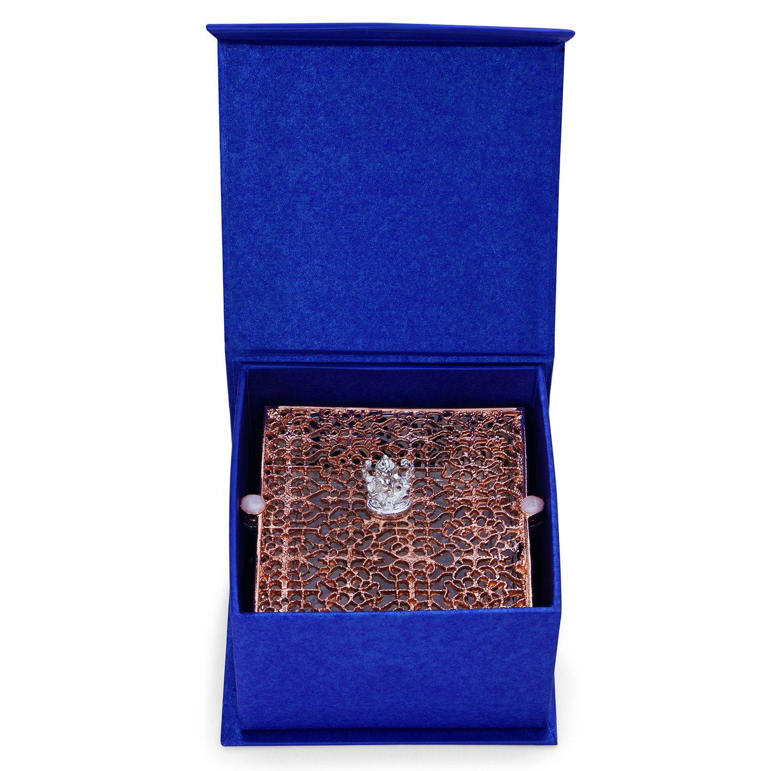 The box features a square decorative base with an intricate rose gold lattice pattern layered over a glossy reflective surface. At the center sits a finely crafted Ganesh idol, symbolizing wisdom and prosperity.