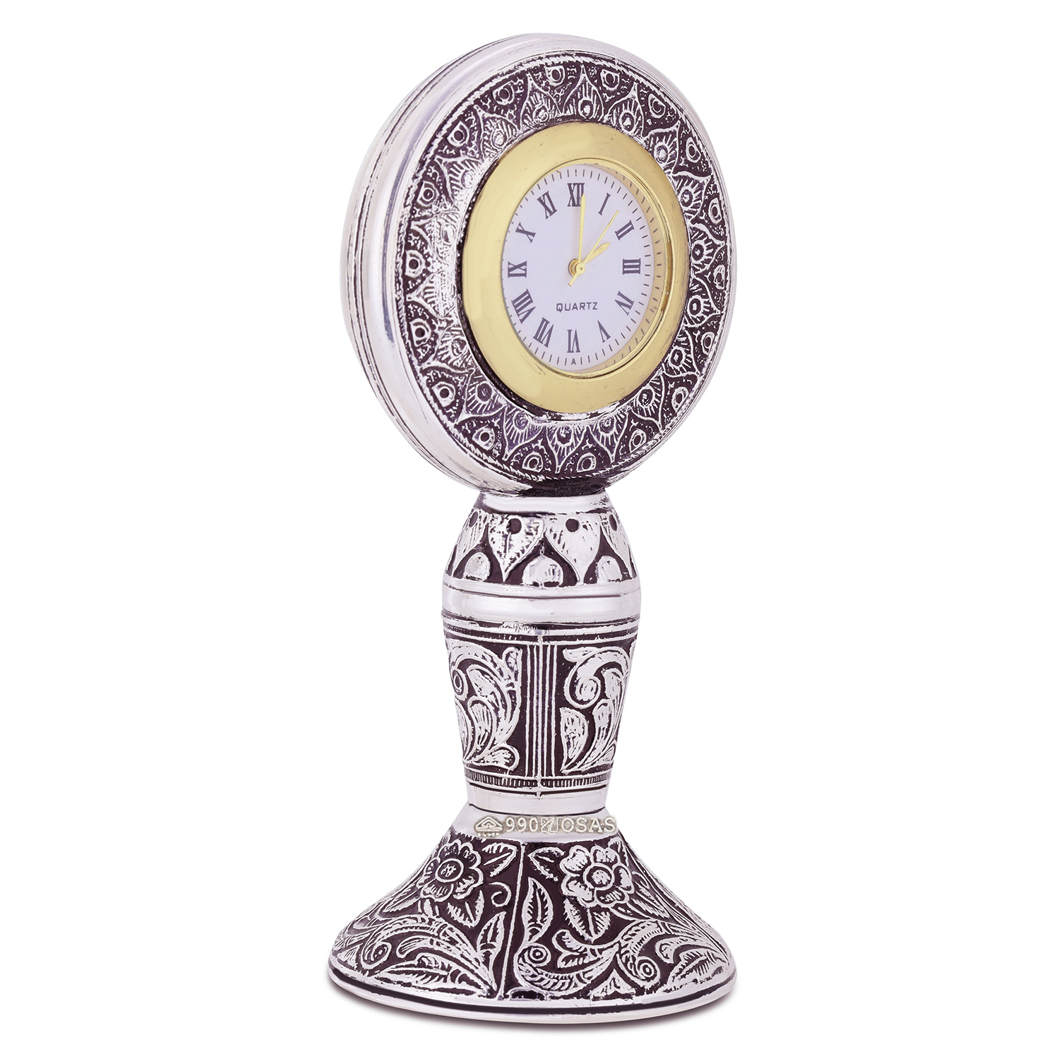 ​This elegant desktop clock features a small round analog clock mounted on a pillar like stand. Crafted with a thin sheet of pure silver, on a unique clock. The clock is adorned with intricate engravings and operates on battery power.