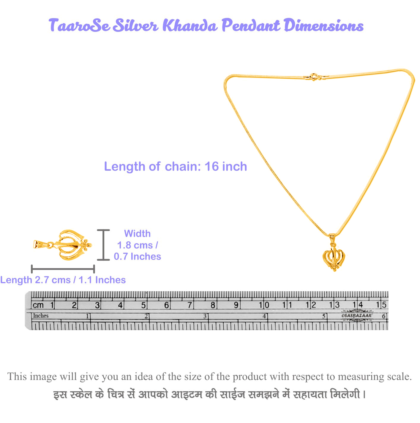 Length: 2.7 cm Width: 1.8 cms. Pendant Weight: Approx. 2.0-2.2 gms. Chain Length: 16 Inches. Chain Weight: Approx. 2-3 gms