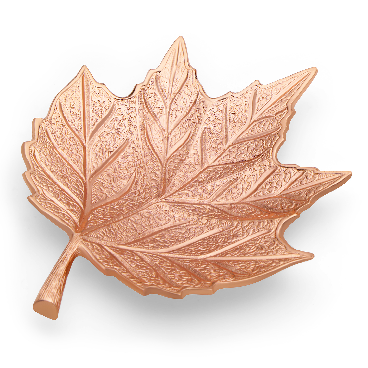 Add a touch of elegance and sophistication to your decor with this beautifully crafted platter. Designed in the shape of a natural leaf, this decorative piece features intricate vein detailing that enhances its realistic and artistic appeal. The premium rose gold finish gives it a luxurious and modern look, making it suitable for both traditional and contemporary interiors. This versatile platter can be used as a decorative centerpiece for your living room, dining table, or pooja setup. It is ideal for serving dry fruits, chocolates, sweets or using as a base festive arrangements.