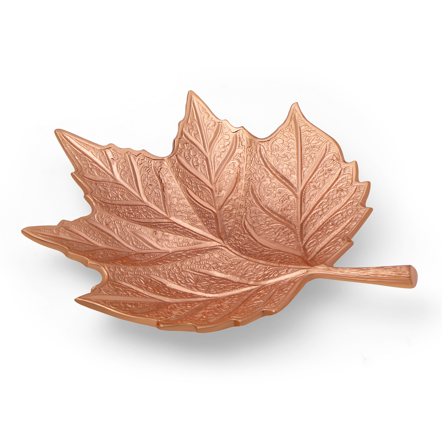 The tray is inspired by the natural shape of a broad leaf, featuring detailed vein textures and floral embossing across its surface. The finely crafted stem handle enhances its authenticity and overall design appeal.