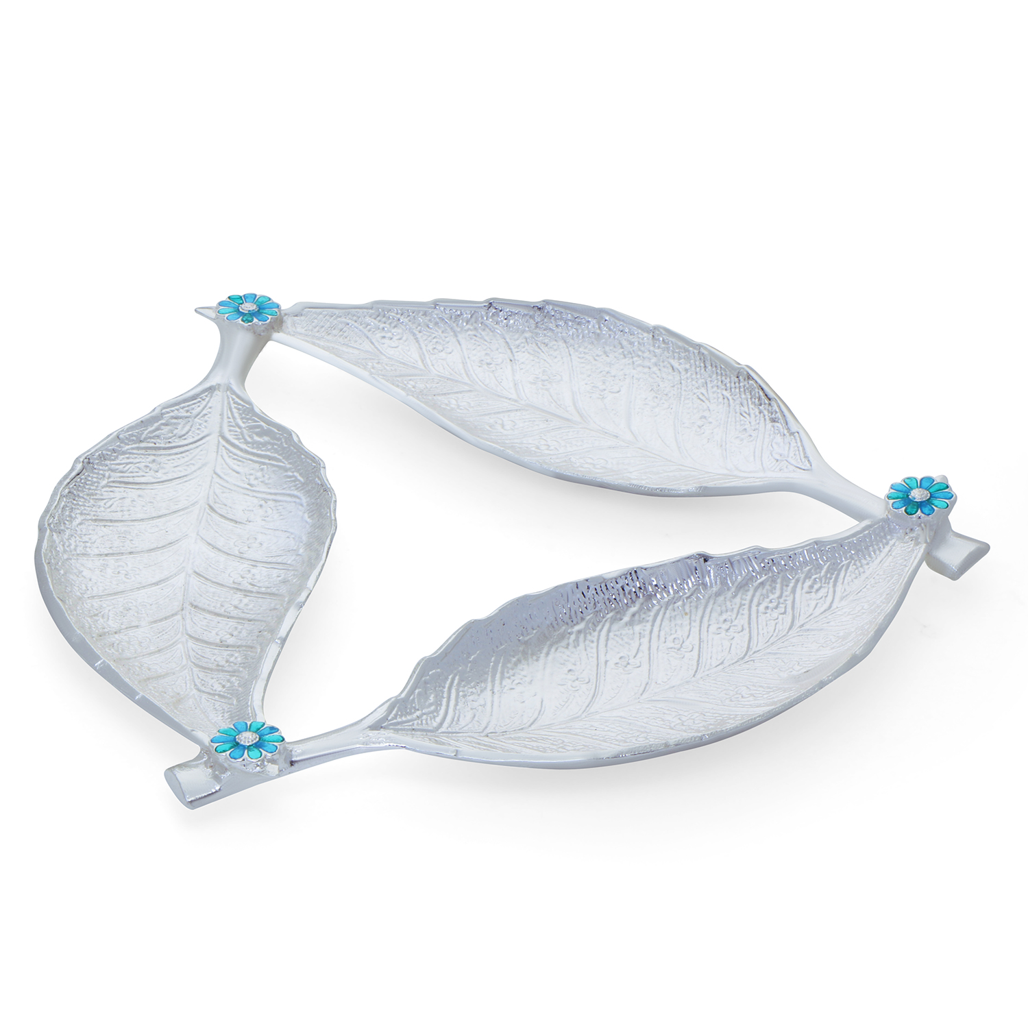 The tray is thoughtfully designed in a three-leaf structure, symbolizing nature, harmony, and elegance. Each leaf features finely embossed vein patterns that replicate the beauty of real leaves. The edges are smoothly contoured, while the stems are joined together with charming blue floral accents, creating a balanced and artistic look.