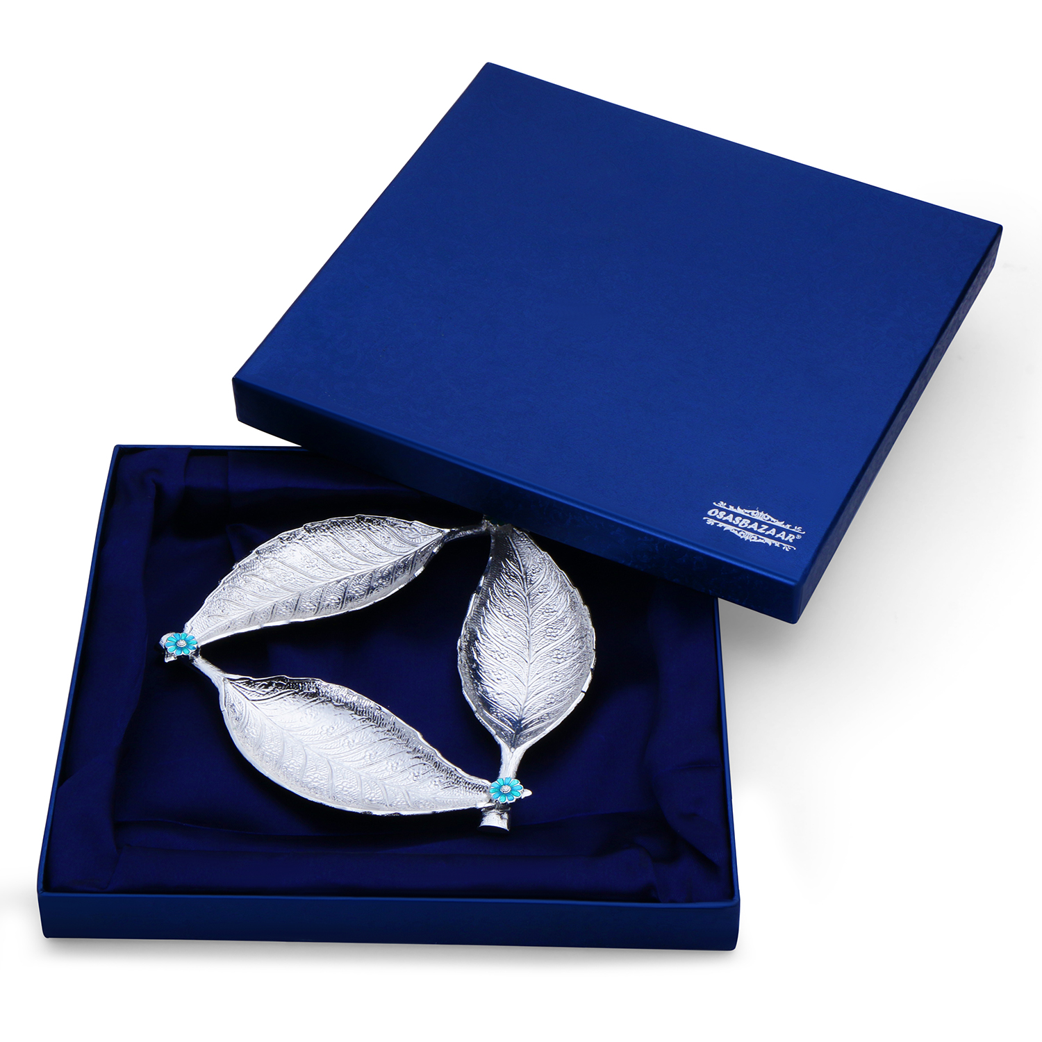 Enhance your home decor and serving style with this beautifully crafted tray in premium silver plating. Designed in a unique triple-leaf formation, the tray showcases intricate leaf vein detailing that gives it a natural and elegant appearance. The delicate blue floral accents add a subtle touch of charm and sophistication. Perfect for serving dry fruits, sweets, chocolates, mukhwas or small snacks during festivals, family gatherings, and special occasions. It can also be used as a decorative centerpiece for your living room, dining table, or pooja setup.