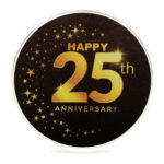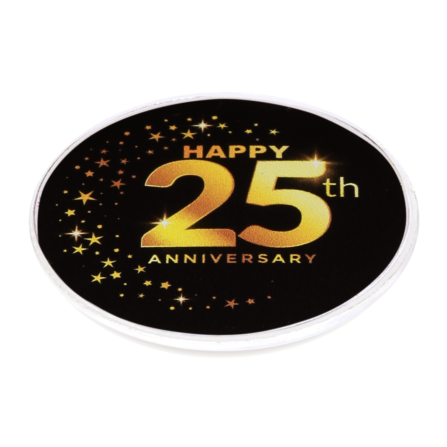The front of the coin has a beautiful black background with Happy 25th Anniversary written on it along with sparkling stars around it. The back of the coin is inscribed with our logo and BIS Hallmark. This may however vary on availability.