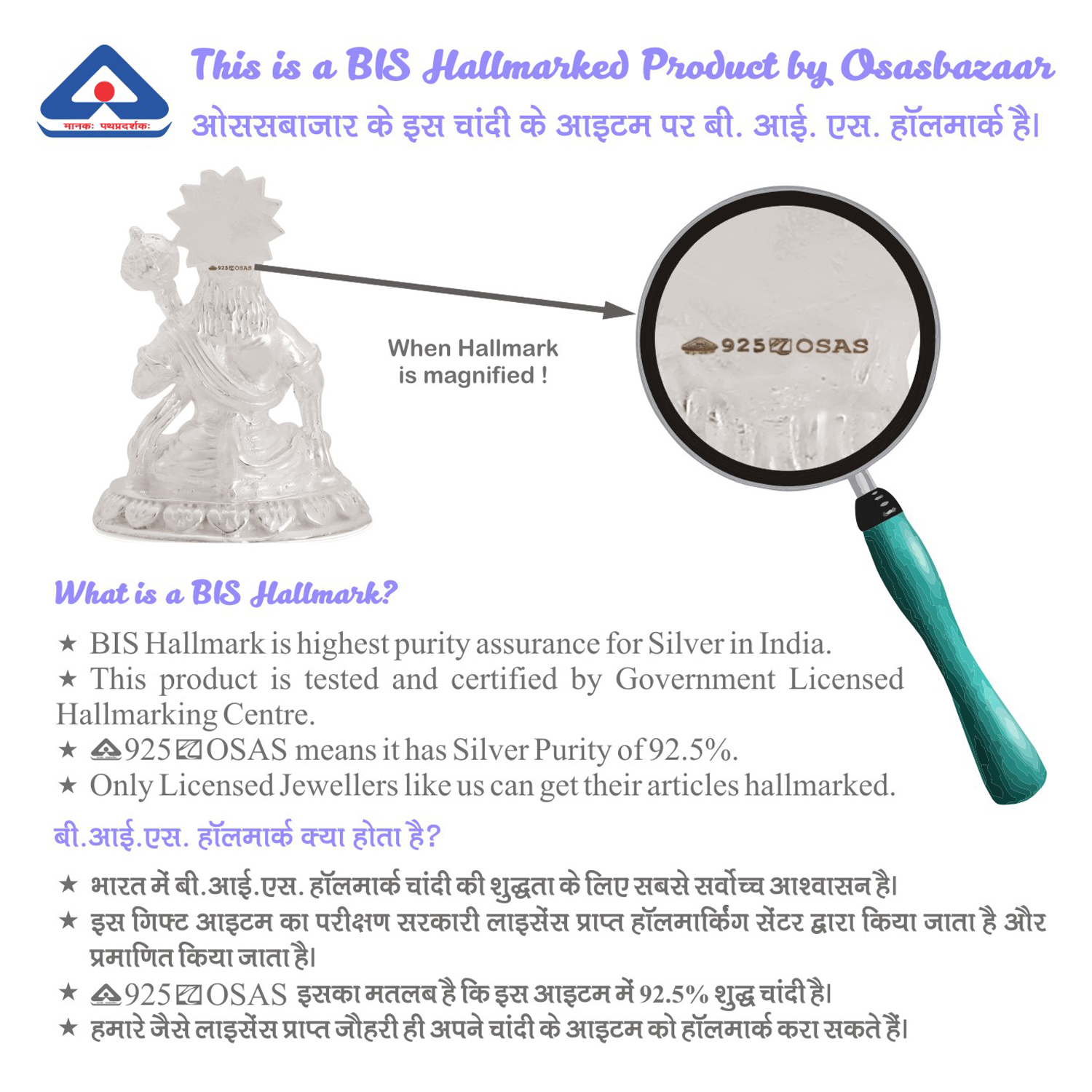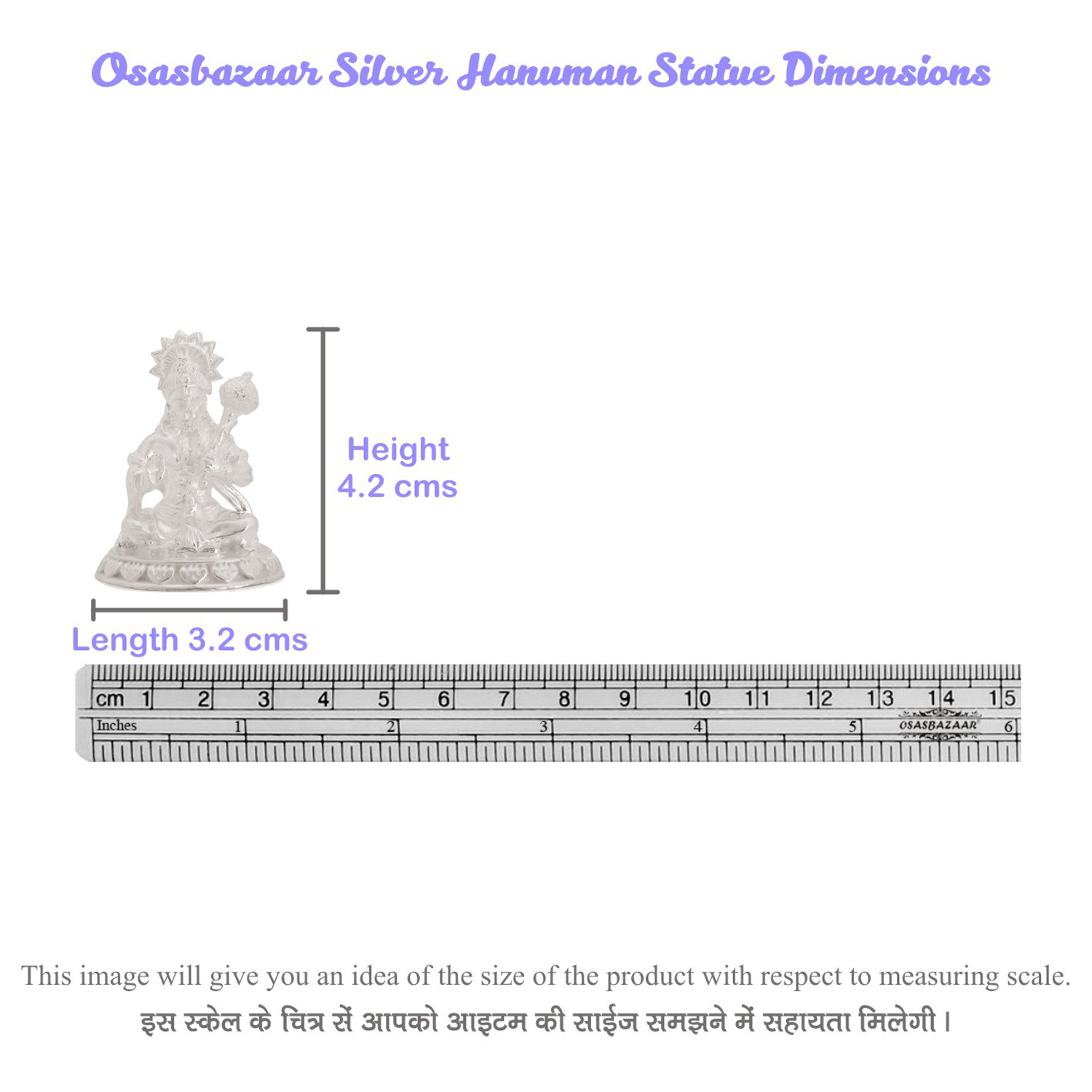 Osasbazaar Pure Silver Hanuman Statue – BIS Hallmarked: Lord Hanuman is the God of power and protection. He is known to be the slayer of demons, evil spirits and negative energies. Worshipping silver bajrangbali idol will bring protection, positive energy, and happiness in your home and office. Silver is a pure and holy metal. It attracts positivity and peace around us. Place this magnificent Hanuman Idol in your home or office temple for spiritual enhancement in your life. This silver hanuman murti will help you overcome negative problems like anxiety and fear, and give you confidence, induce courage and peace of mind. Improve your mental strength by devoting some of your precious time worshipping this divine silver hanuman statue. Give true holy blessing to your loved ones by gifting them this pure solid silver Hanuman idol on any auspicious occasion.