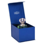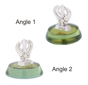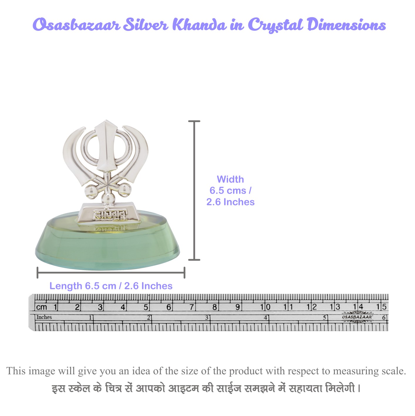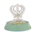 This Khanda statue is made of pure silver on a sturdy glass base. In the center, there is a double-edged sword with two curved kirpans around it. There is also a circular disc in the centre. It has Waheguru inscribed on it.