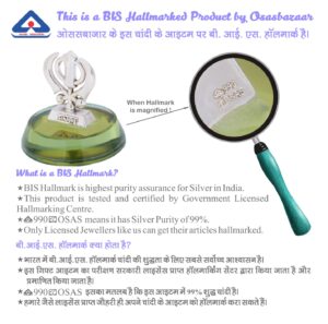 Osasbazaar Pure Silver Khanda with Waheguru embossed on it – BIS Hallmarked: The Khanda is a special symbol in Sikhism, and this one is made from pure silver which attracts positivity in life. The double-edged sword at the center shows strength and courage. Two curved kirpans around the sword represent spiritual and worldly power, balanced by a circular disc called the Chakkar. What makes the Khanda unique is that it has Waheguru embossed on it, which reminds Sikhs of the Supreme Being and their commitment to Sikh teachings. Having a Khanda in your home or office is nice because it reminds you to be kind and fair, just like Sikh values teach. It encourages you to face challenges with bravery, do the right thing, and work towards unity and lasting happiness. It is a symbol of your faith, a beautiful and meaningful piece of art and wisdom to have around.