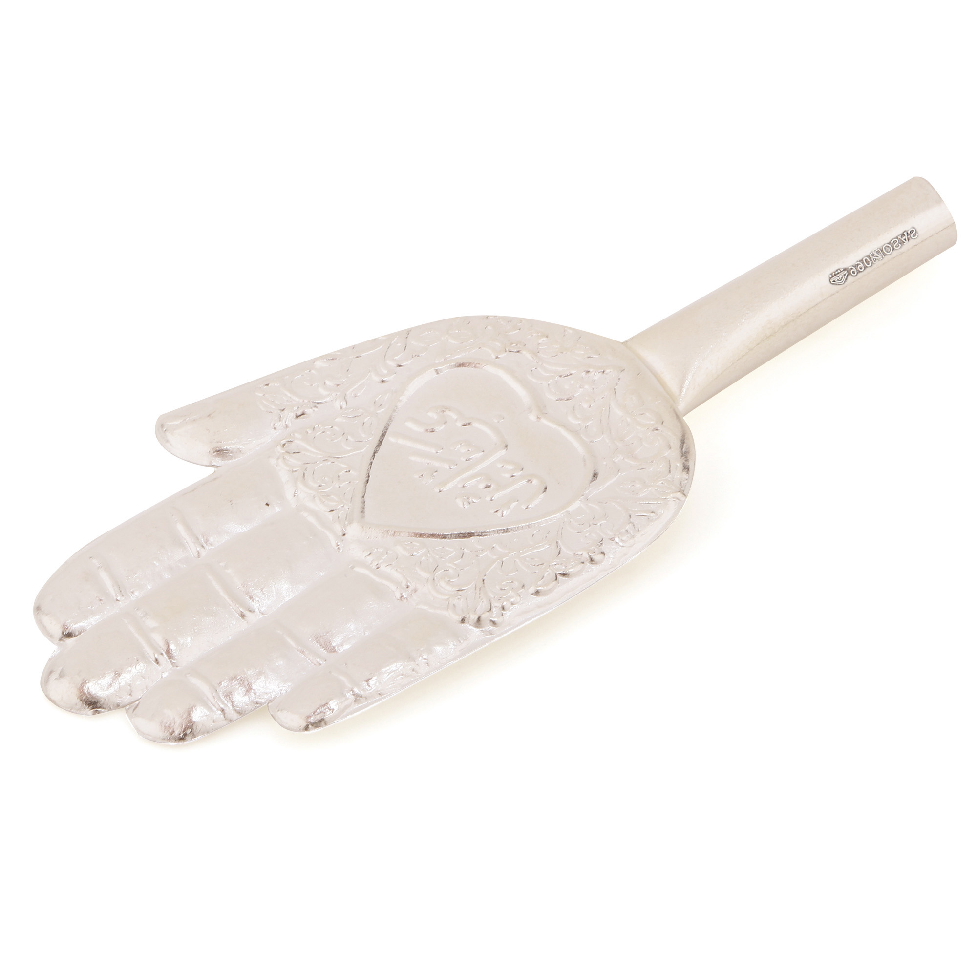 This is a small silver piece shaped like an open hand, which symbolizes protection and faith. It has fine engravings of patterns giving it a special and elegant look.