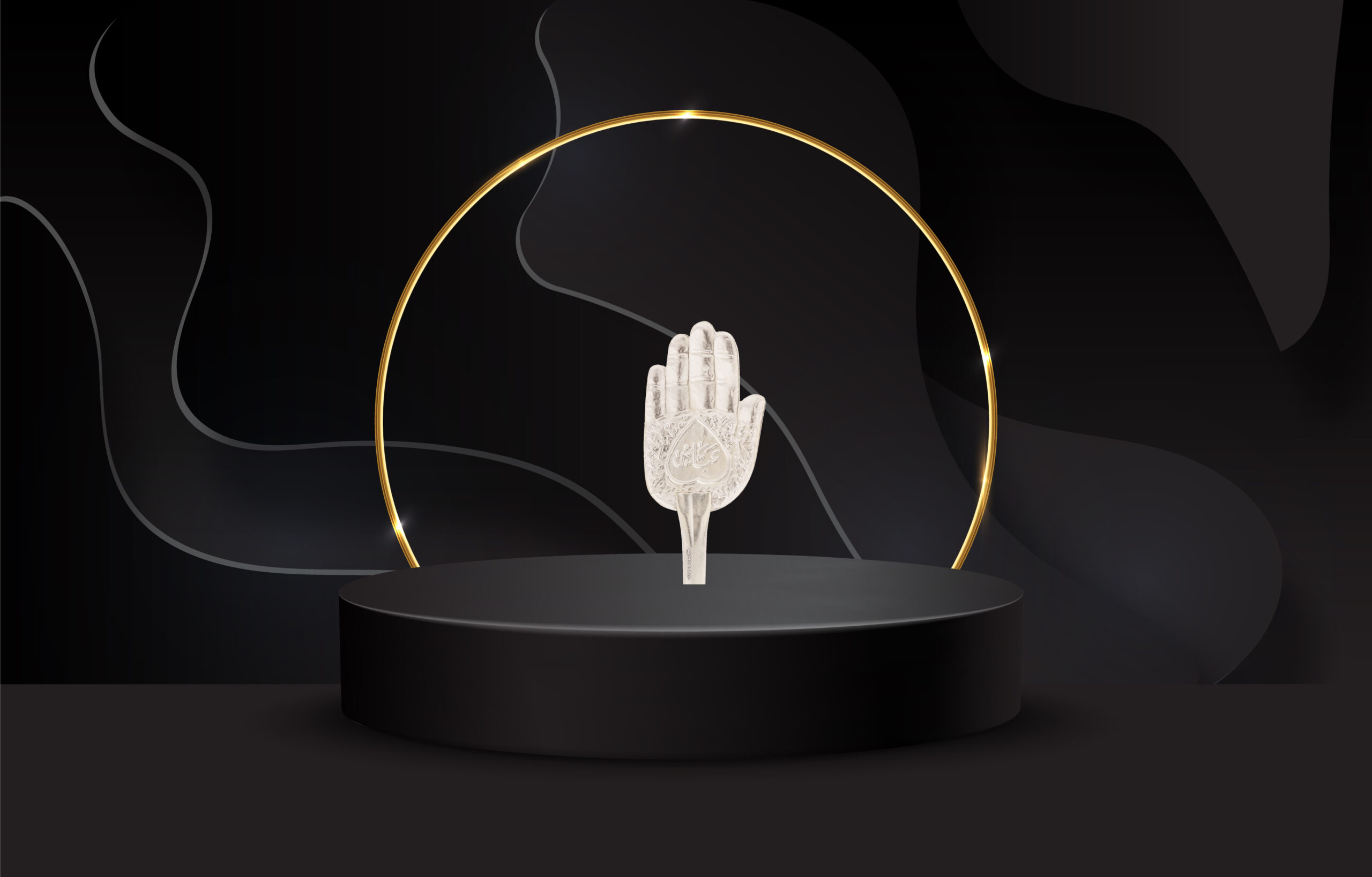 The Panja or Protective Hand shaped Alam is considered the most sacred. Five fingers of the protective hand symbolize the last prophet Hazrat Mohammad, Hazrat Fatima, Hazrat Ali, Hazrat Hasan and Hazrat Husain. This Panja alam is fully inscribed on both sides. This Panja enriches gatherings with its profound significance. Panja brings a special beauty to the Panja making it a unique masterpiece. A religious symbol that represents the identity of Shiasm.
