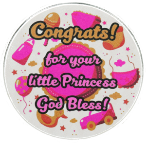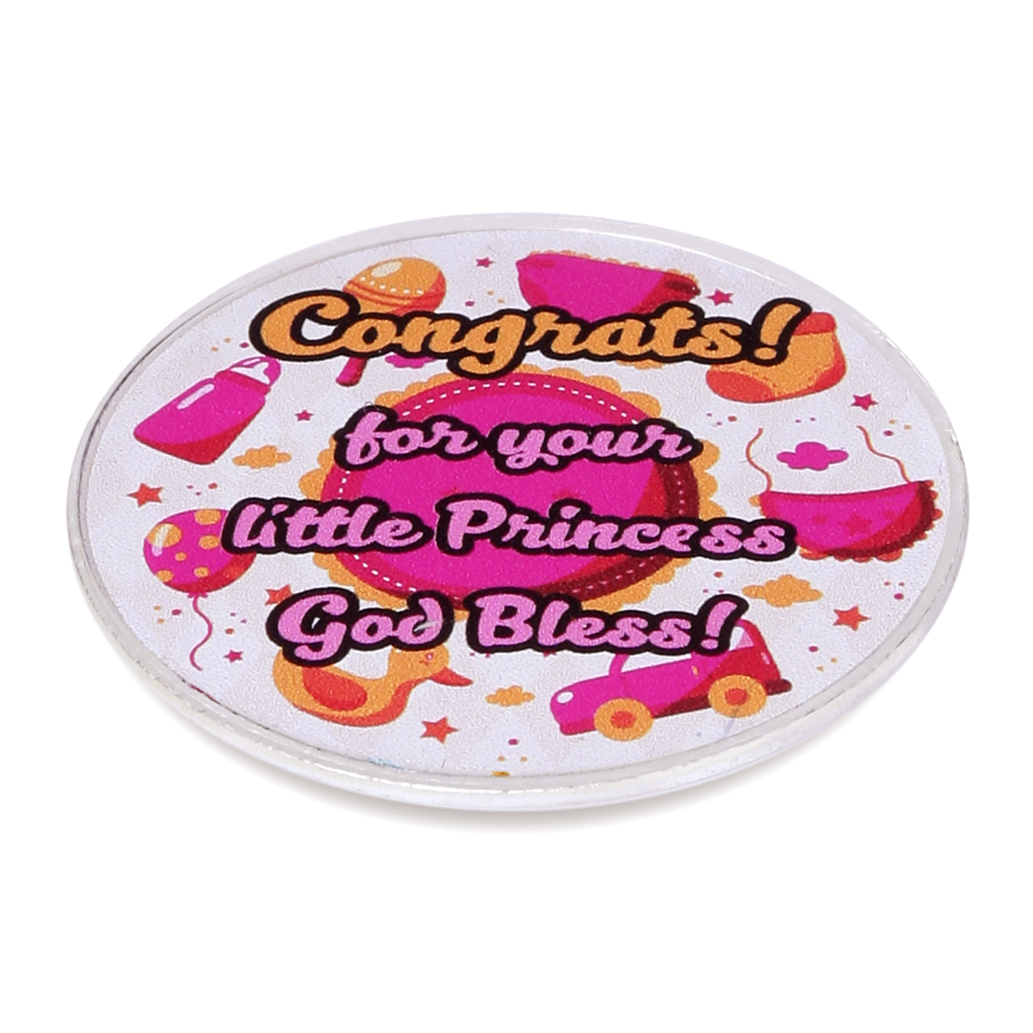 The front of the coin has a beautiful background of cute little pink baby items like balloons, toys, bib, milk bottle, etc. adorned around the text “Congrats! For your little Princess, God Bless!” The back of the coin is inscribed with our logo and BIS Hallmark. This may however vary on availability.