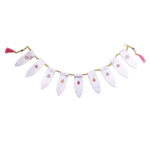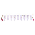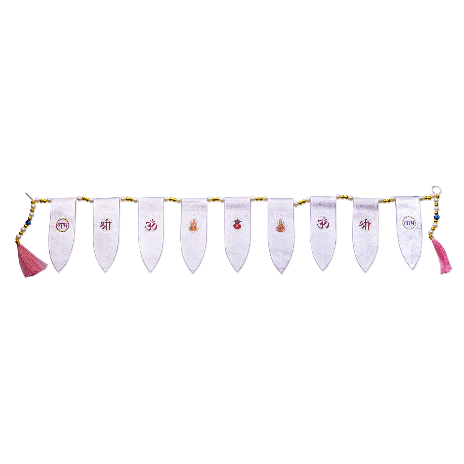 The bandarwal has silver leaves in the shape of ashoka leaf. There are 9 leaves hanging on a thread. The leaves have a design of Ganeshji, Lakshmiji, Kalash, Om, Shree, Shubh and Labh each. The thread has white and golden beads with evil eye beads and tassels at the end.