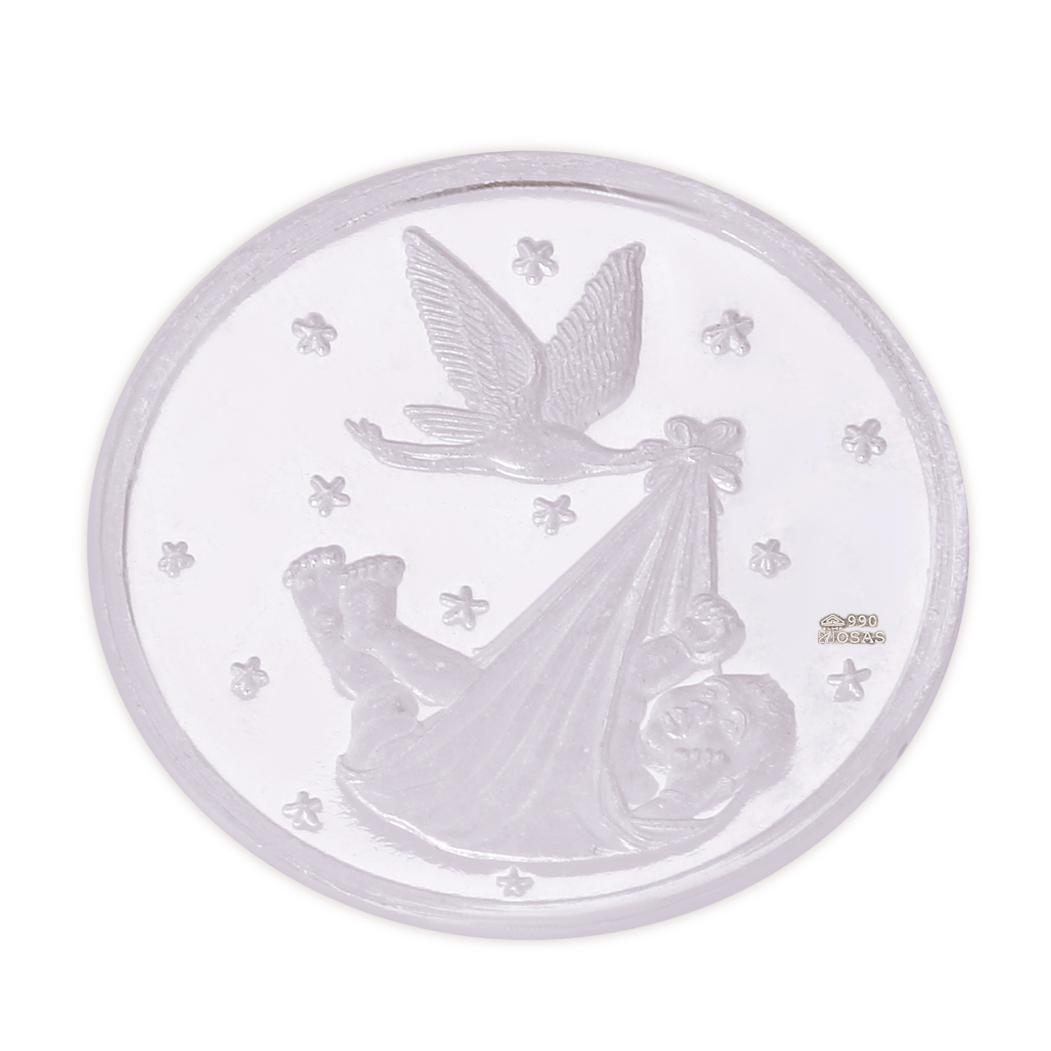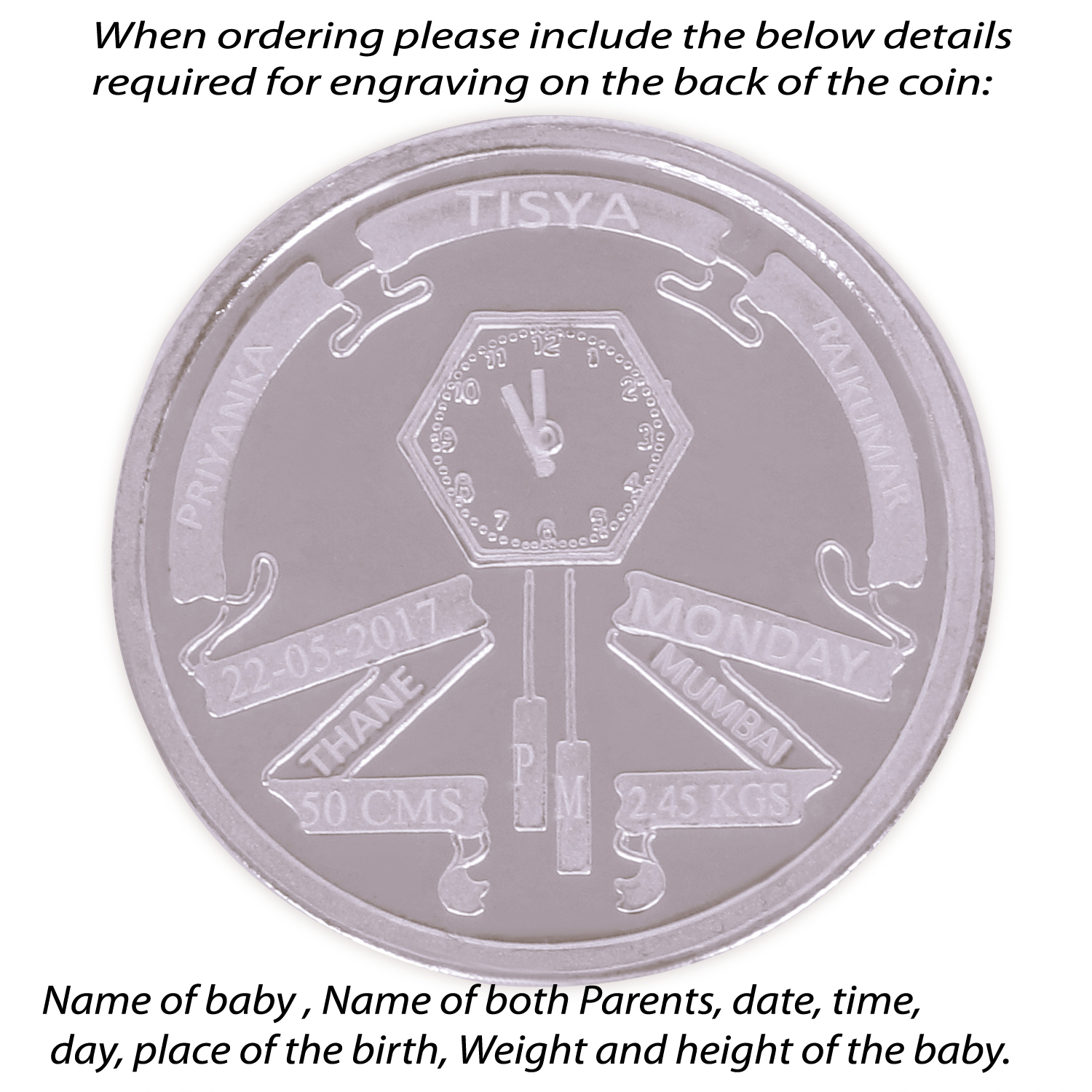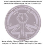 The front of the coin has a cute baby carried by a bird implying the arrival of a baby. The back of the coin is inscribed with the details of the birth.