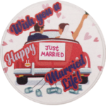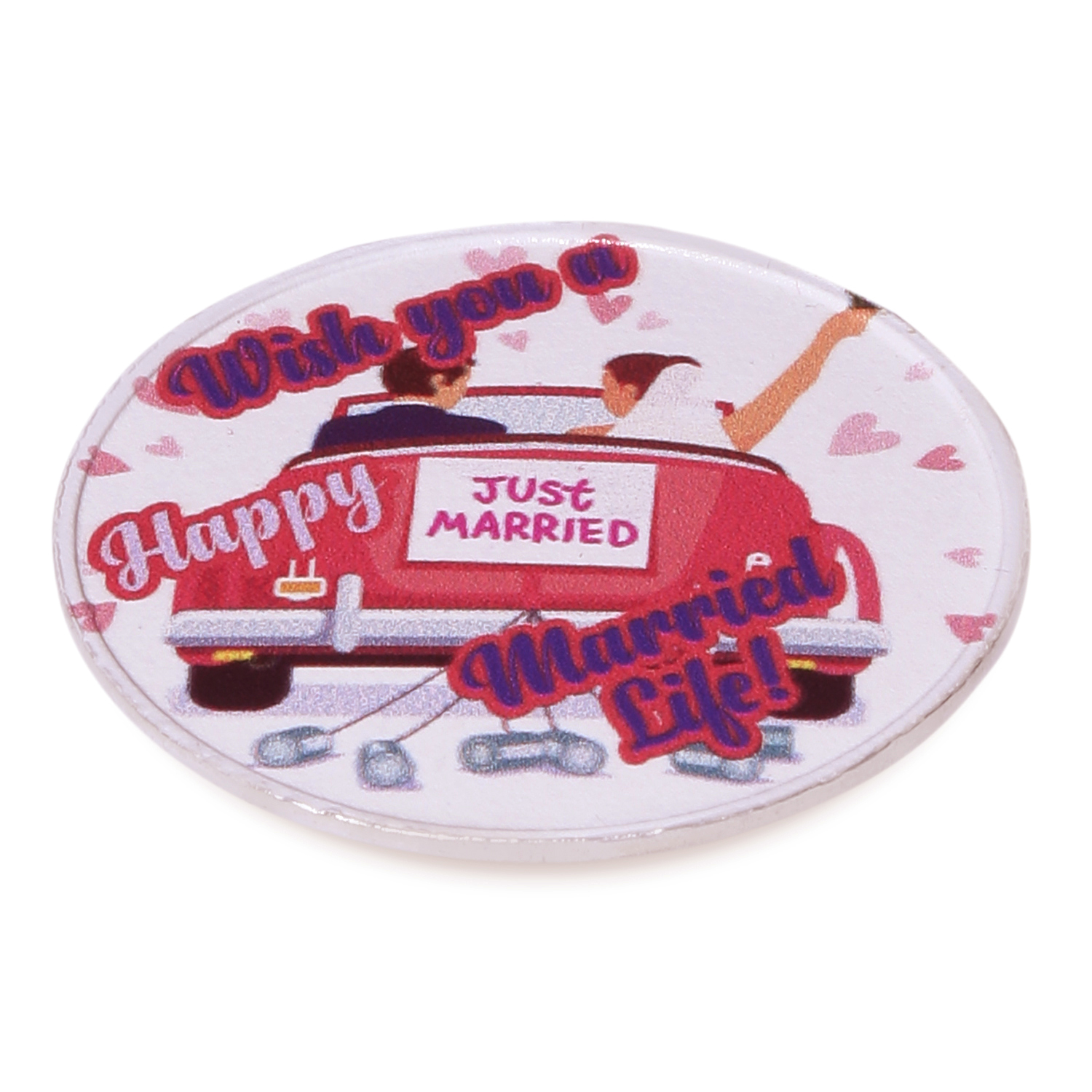 The front of the coin has a beautiful background with a hearts on it with a bride and groom sitting in a car and the words Just Married behind the car. The words “Wish You A Happy Married Life” is elegantly written around it. The back of the coin is inscribed with our logo and BIS Hallmark. This may however vary on availability.