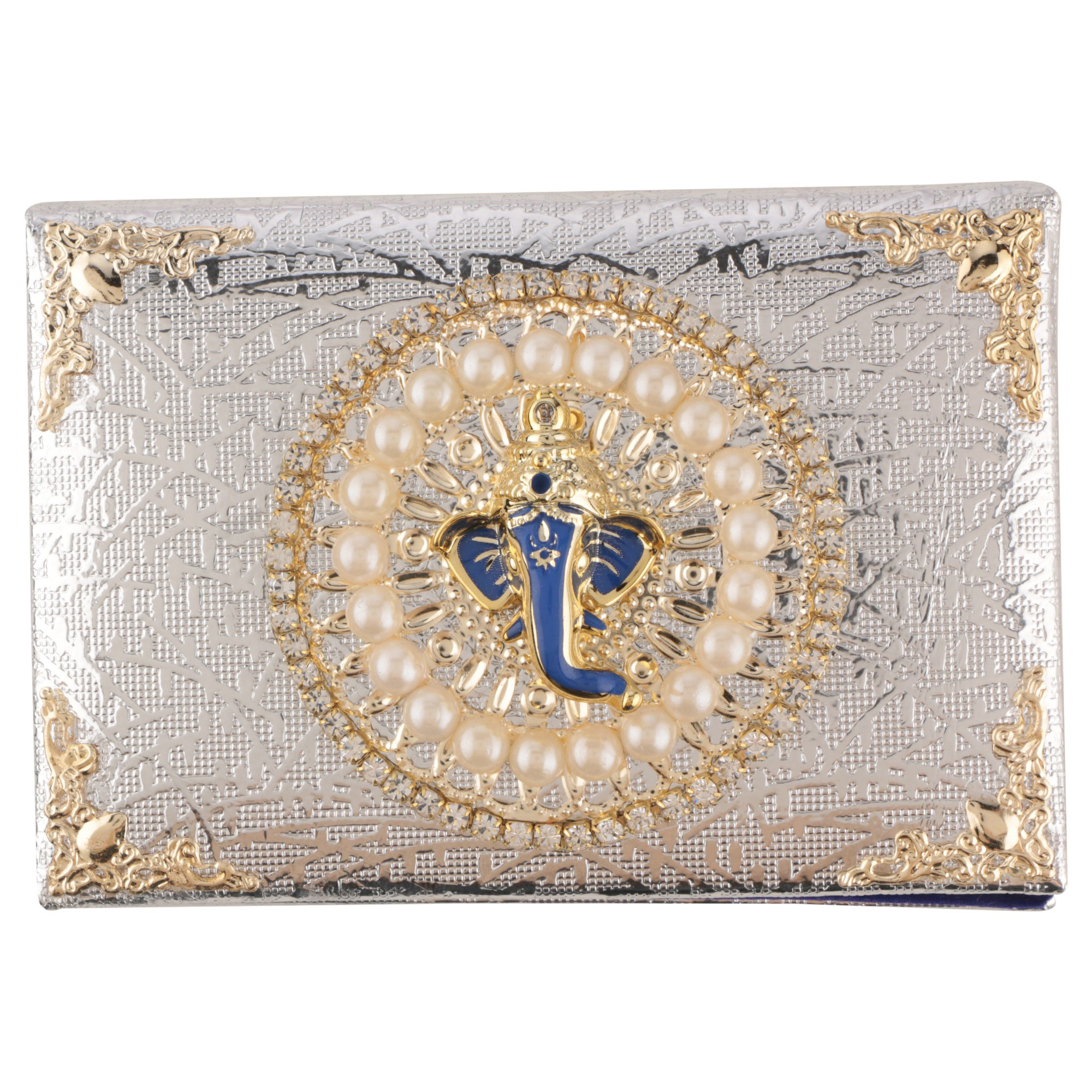 Silver Leatherette Box with Blue Velvet Base and very pretty golden corners. The top of the box has divinely decorated Ganesh ji on a golden frame with a ring of artificial pearls and diamonds giving it a very elegant and designer look. Available in Packs of 1, 2 and 4.