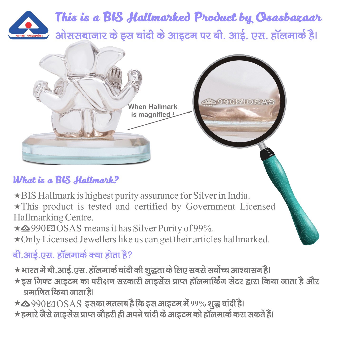 Osasbazaar Pure Silver Ganesh Idol on a Glass Base for Puja and Gifting – BIS Hallmarked:
