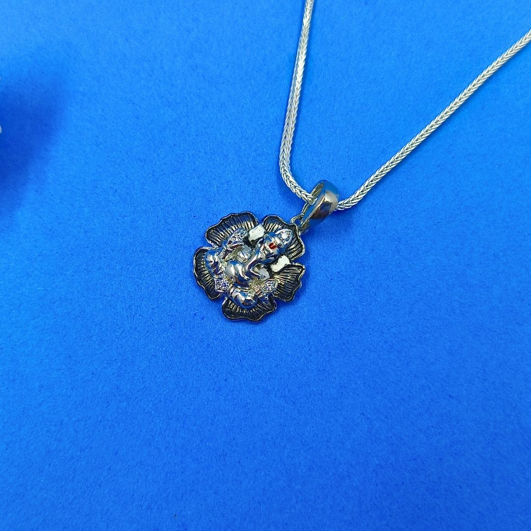 Silver Ganeshji in Hibiscus Flower Pendant and 16 inch Chain for Kids