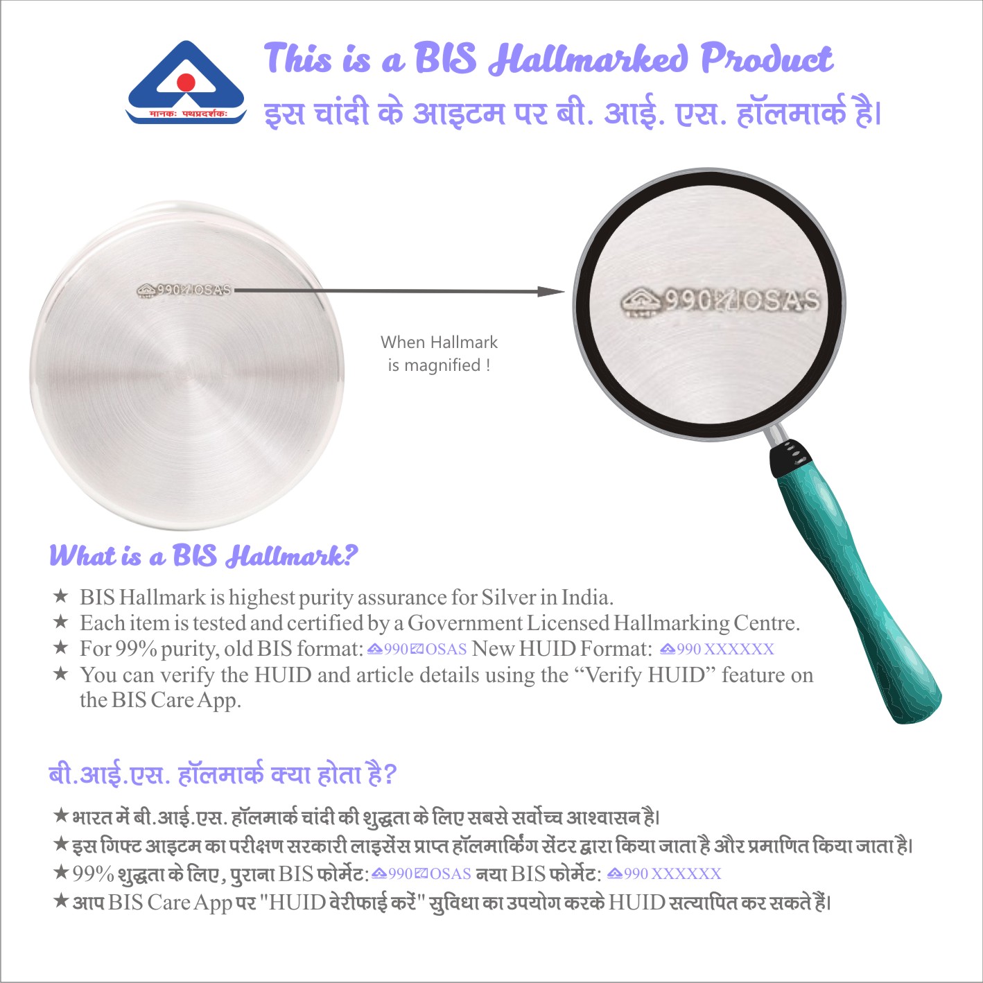 Silver is considered to be a holy & pure metal. It is believed to channel positive energy around you. That is why silverware is used in Pooja. Also it is anti-bacterial and very hygienic. This fine silver glass is perfect for place of worship – at your home or office. Also, show off your classy side when you invite guests over by serving any drink in this appealing glass. And as per Indian Tradition of gifting silver items this glass can be gifted on every occasion – big or small, especially weddings. Other Silverware like bowl, spoon, plate and glass are also available with us.