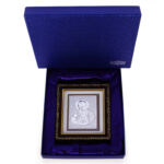 A beautiful image of your favorite God on a pure silver sheet. The wooden frame has clear acrylic front with golden borders which add more beauty to the whole frame. It has a hook attached for wall mounting along with a table stand.