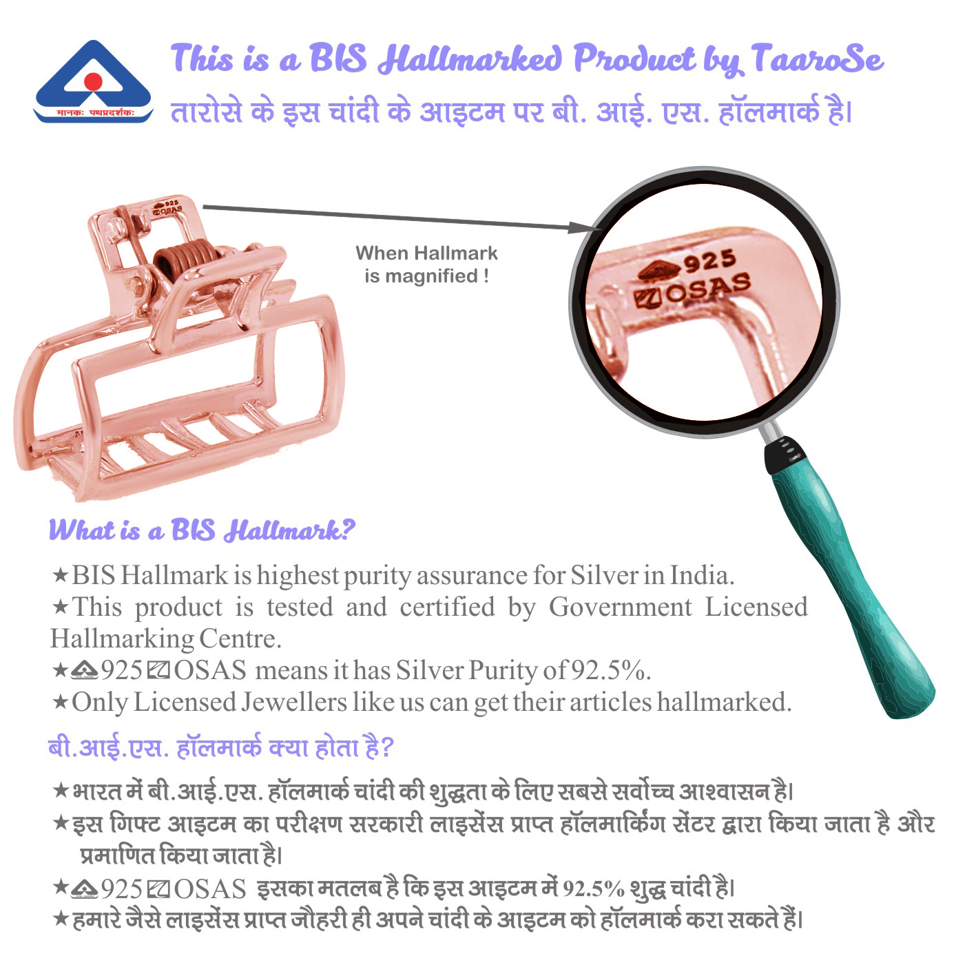 Taarose by Osasbazaar 925 Sterling Silver Hair Clutcher in Rectangle shape – BIS Hallmarked: