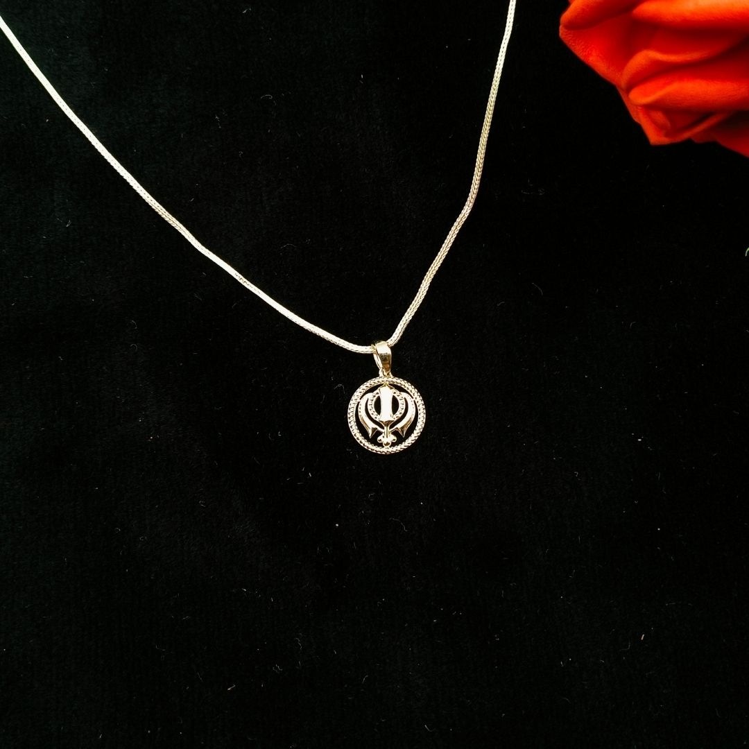 Our Khanda Pendant is a symbol of strength and spirituality. This meticulously crafted piece features the iconic Khanda symbol, radiating a timeless and powerful aura that beautifully encapsulates Sikh heritage and devotion. It comes with a silver snake chain which does not tangle easily, nor catches on hair or other objects.