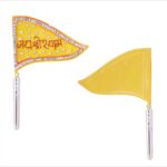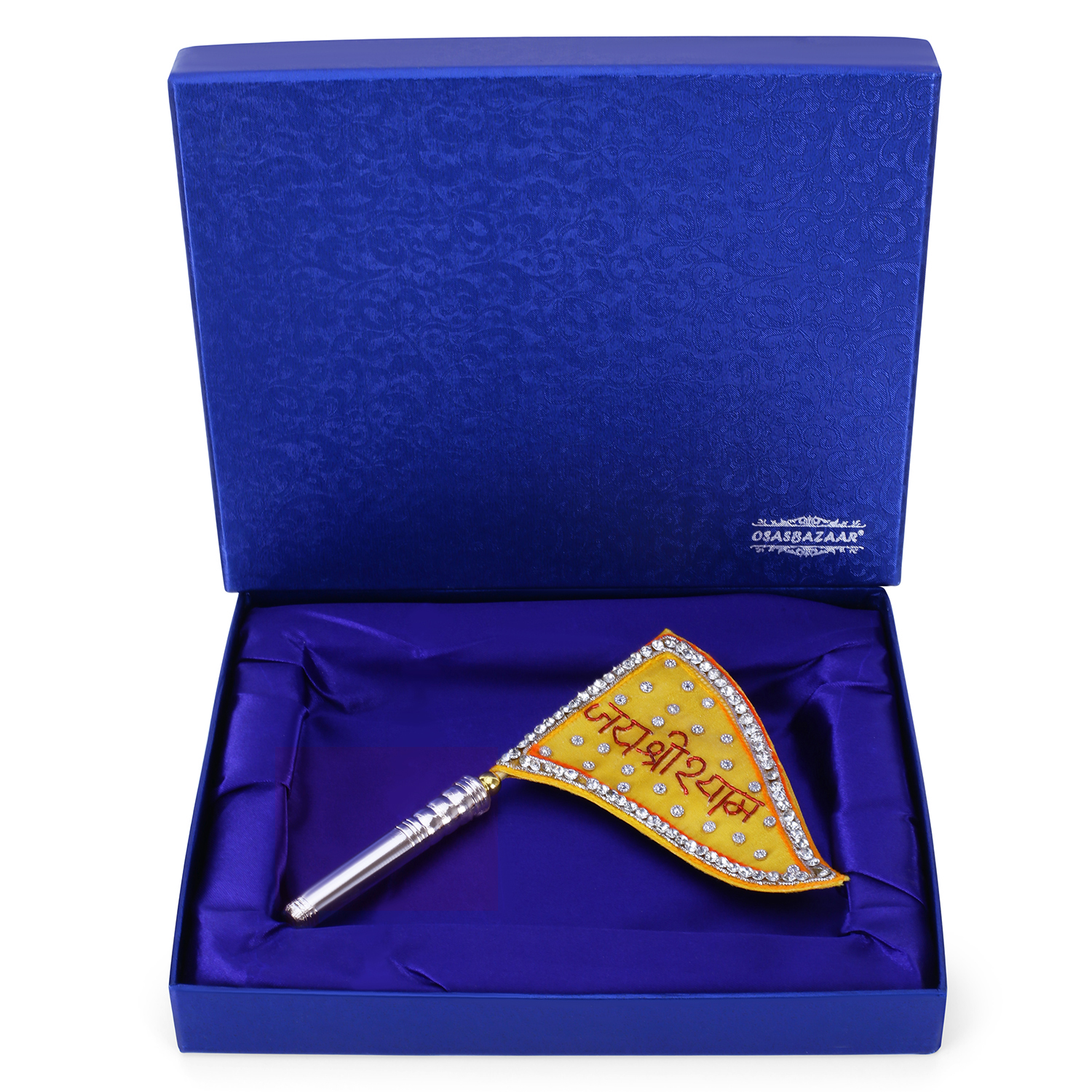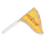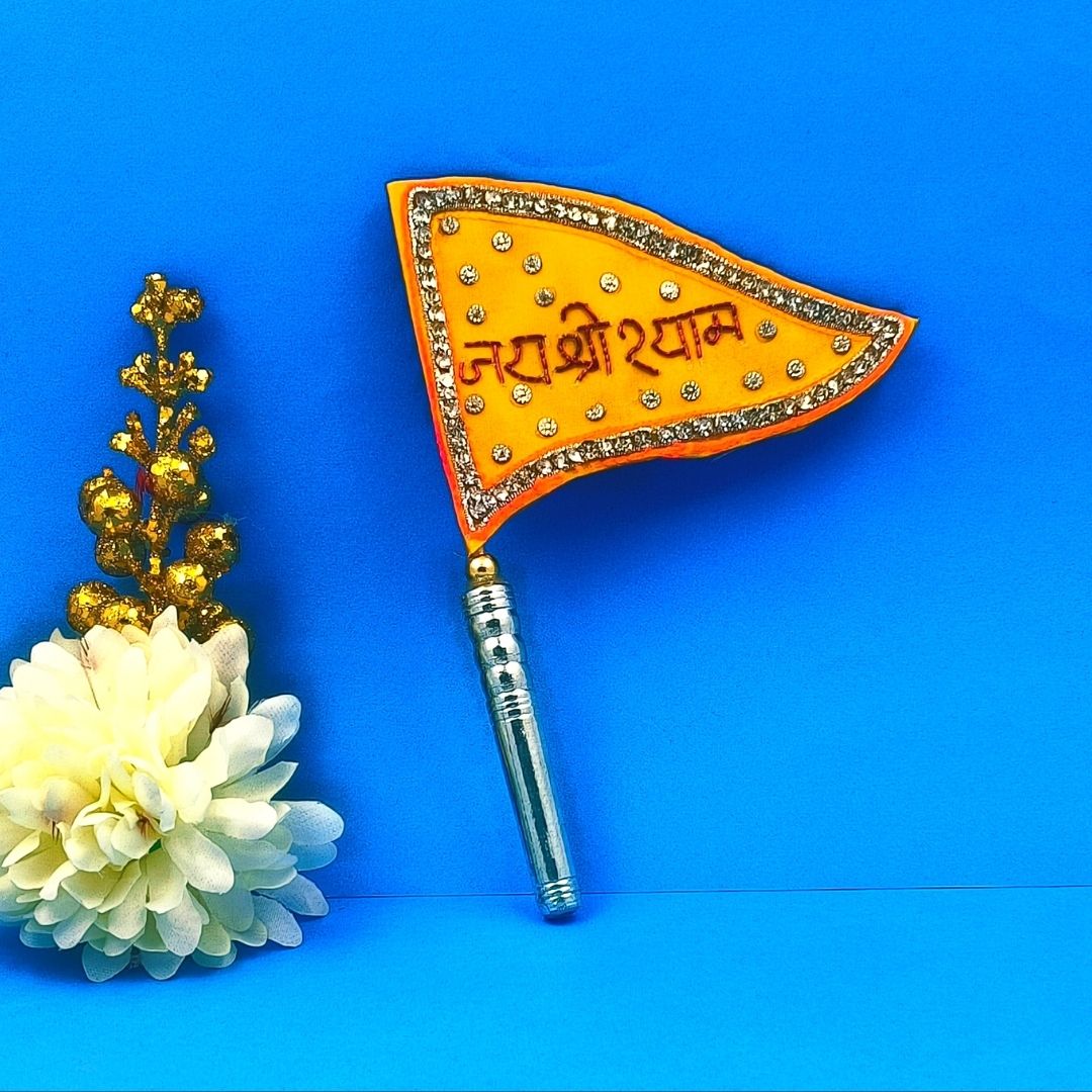 The cloth flag has a border of shiny artificial glass diamonds with Jai Shri Shyam written in the centre. It has a sturdy handle.