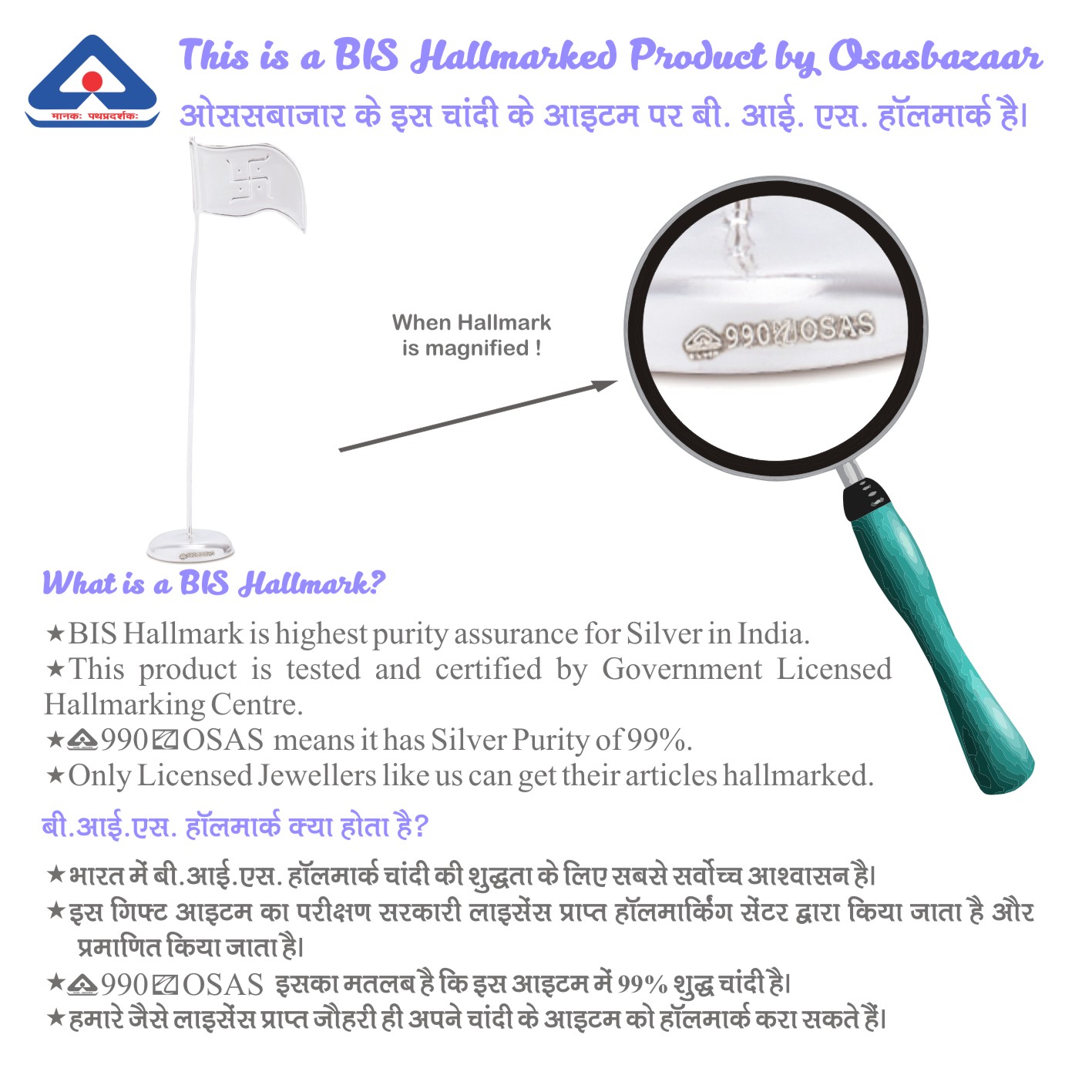 ♥ Material: The flag is wholly made of Silver only. Silver Purity: 97%-99%. Certification: BIS Hallmarked Item