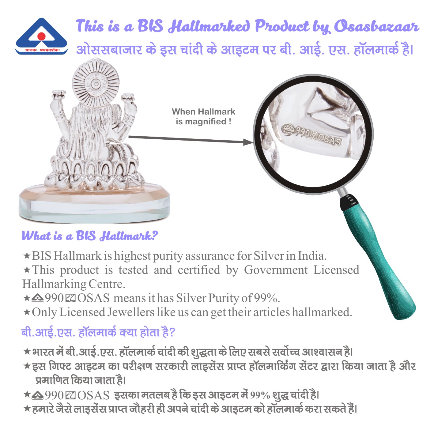 ♥ Material: The Statue is hollow and completely made of Silver. It is stuck to a Glass base. Silver Purity: 97%-99%. Certification: BIS Hallmarked Item