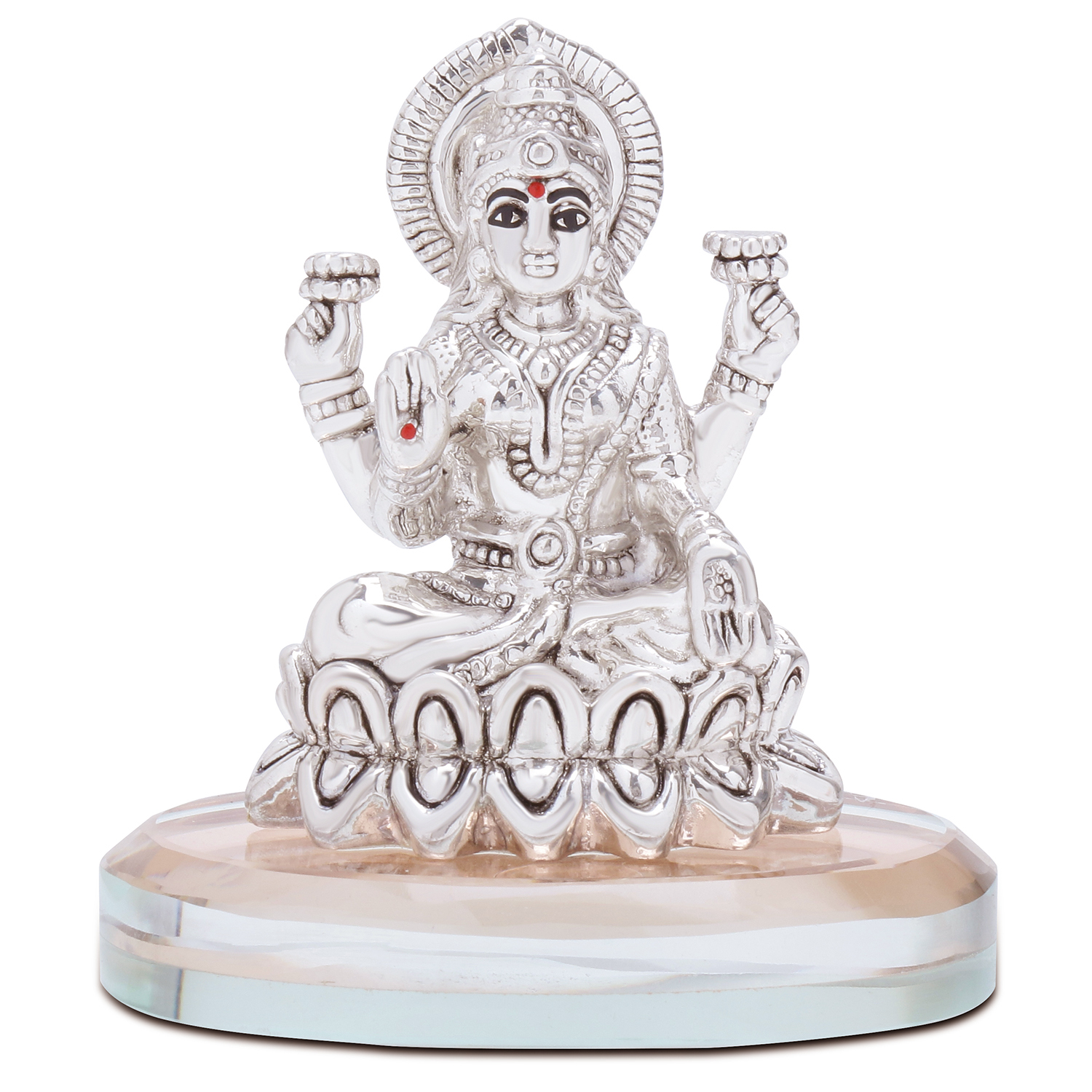 Silver Laxmi ji Statue on a Lotus Flower on a Glass Base