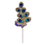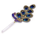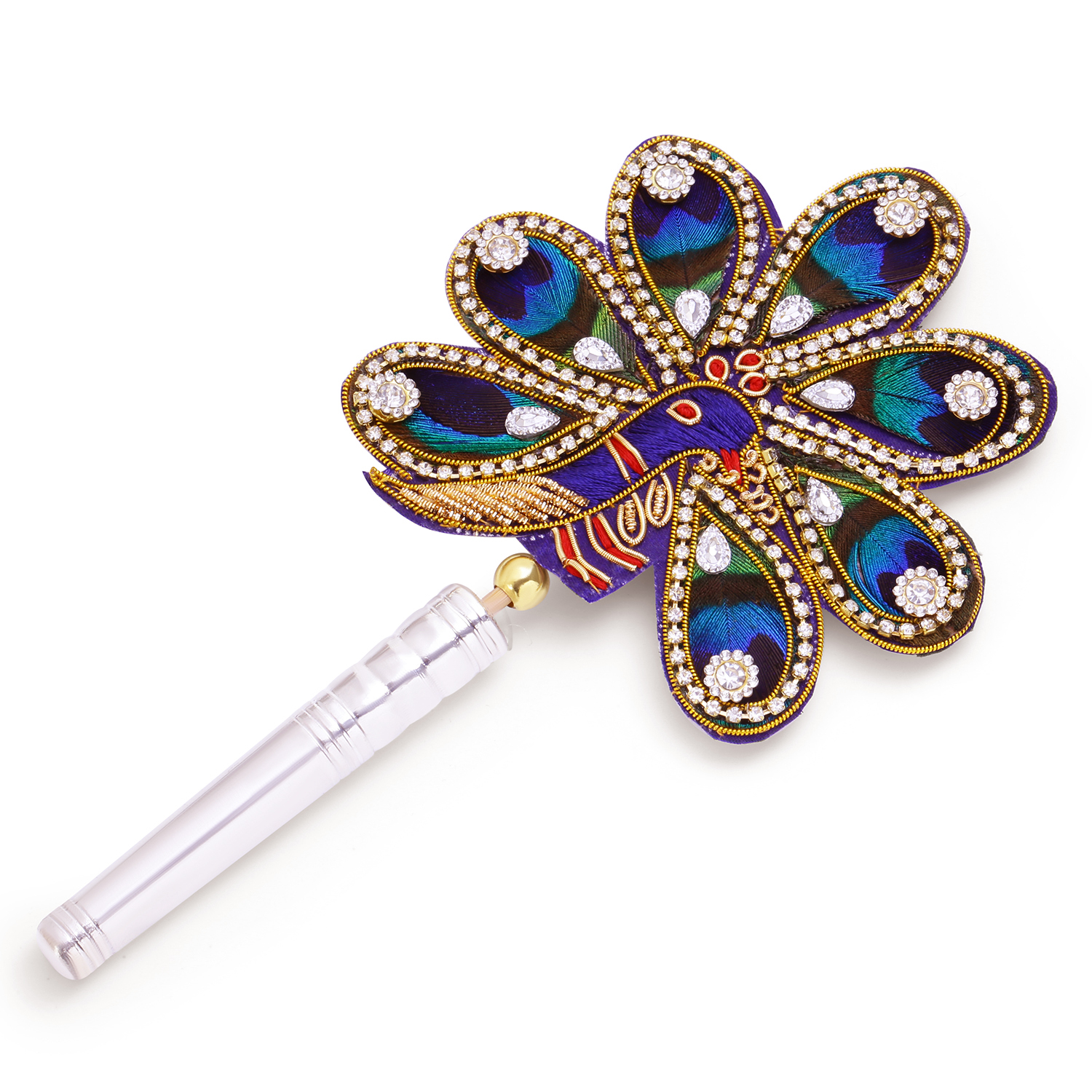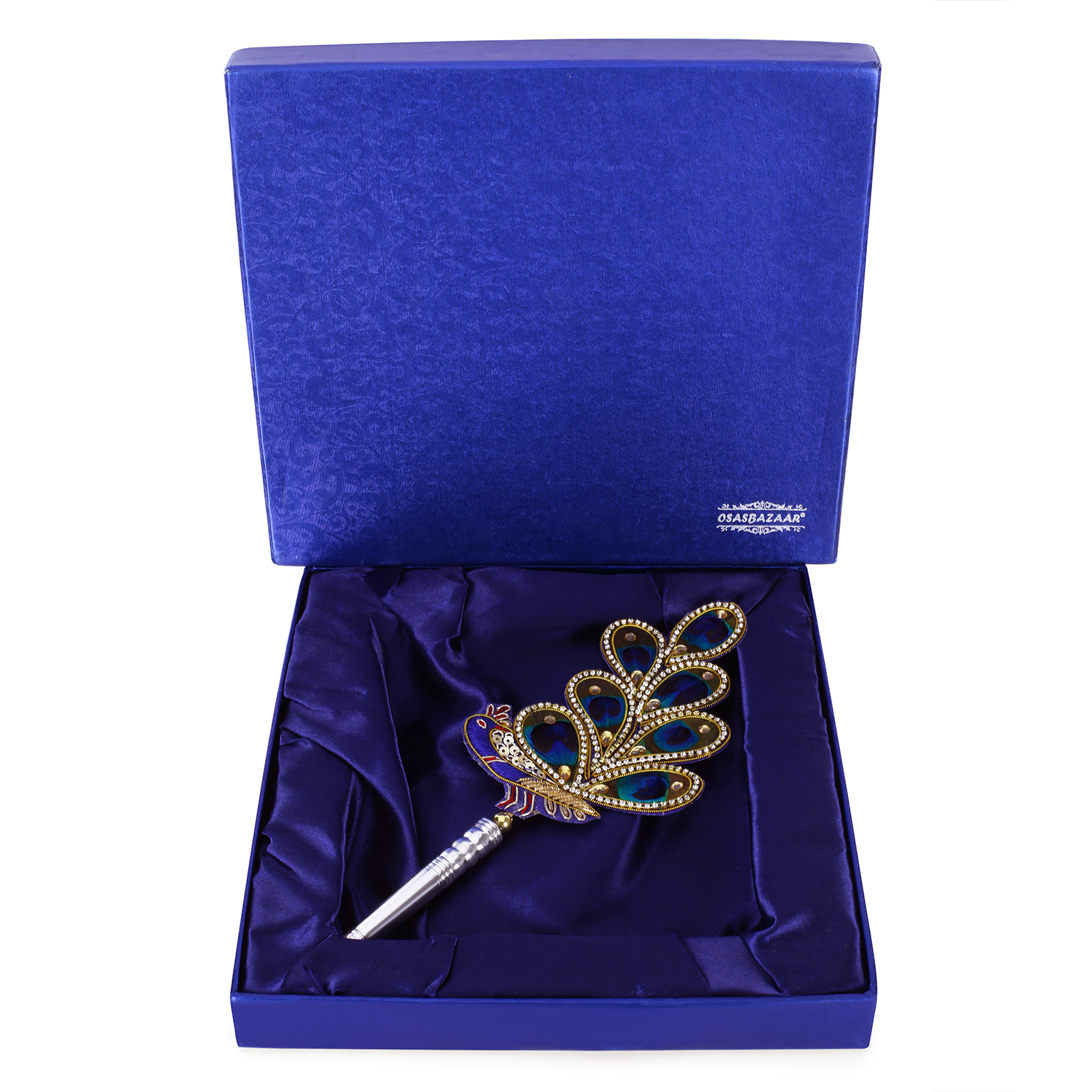 Beautiful natural peacock feathers are arranged together with a border of artificial glass diamonds. It has a beautiful peacock embroidered below the feathers which enhances the look of the feathers. The base is covered with pure silver body of glossy finish.