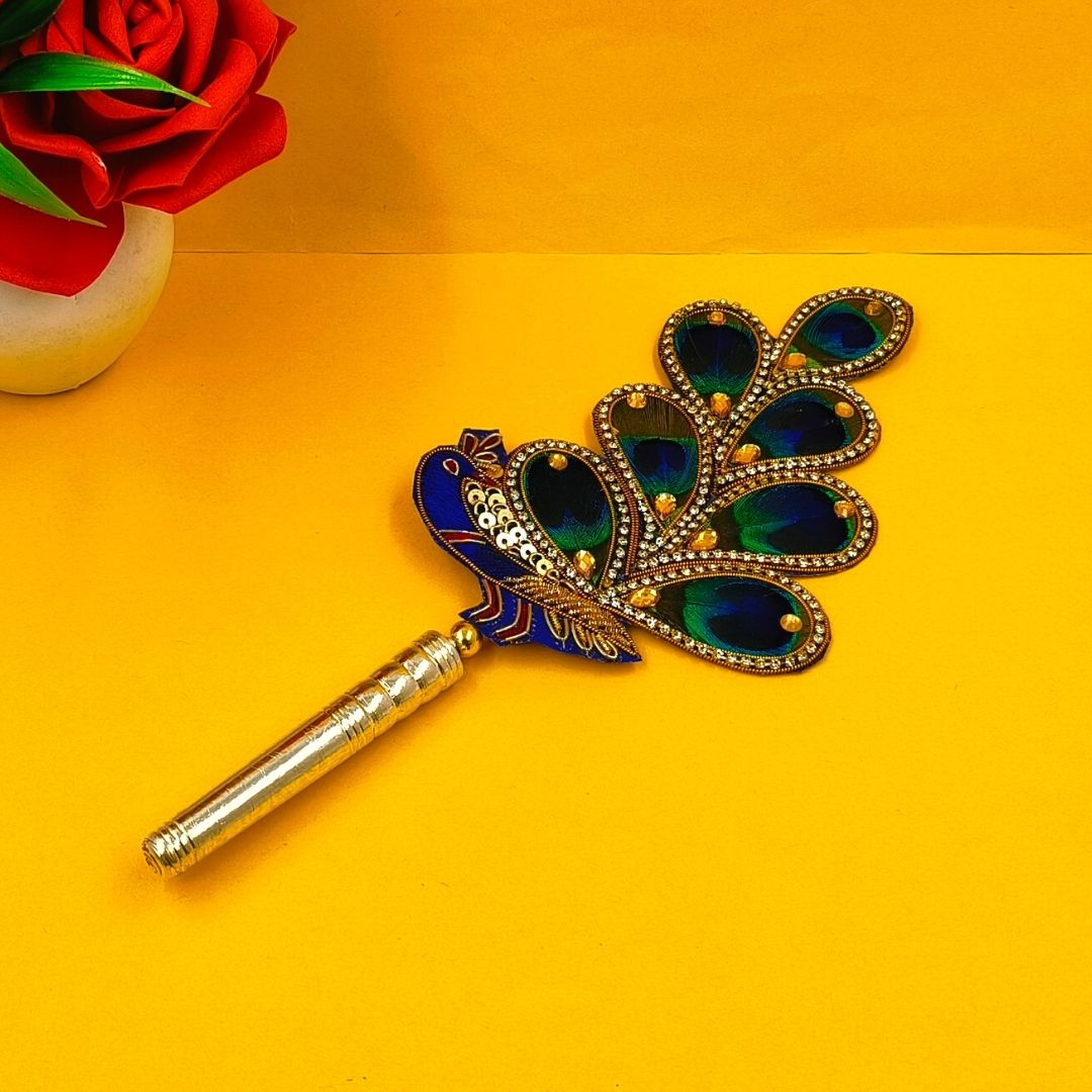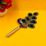 Natural peacock feathers mounted on a base covered with pure silver. It is believed that keeping peacock feathers at home brings good luck and prosperity into the house. The peacock feather is said to attract wealth and gives stability. Keep it near the locker. Peacock feather is also very effective in removing any sort of negative energies or vaastu dosh in the house. However make sure that dust should not be allowed to settle on top of the feather. It also brings Shri Krishnas blessings in the house. It brings protection and love in your house. These natural peacock feathers are collected without causing any cruelty to Peacocks. Keep it in the temple in your home or gift it to your loved ones to see them blessed.