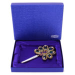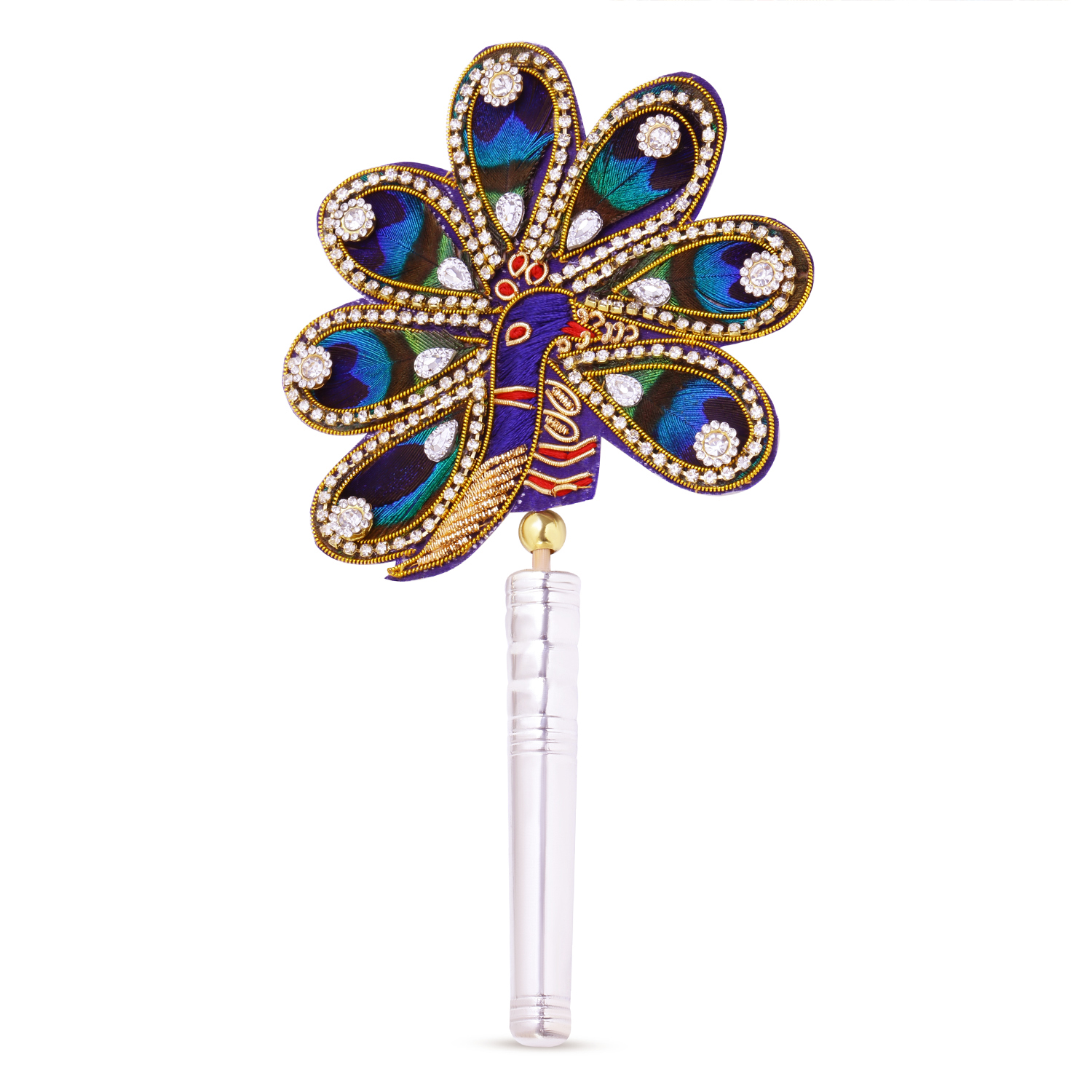 Beautiful natural peacock feathers are arranged together with a border of artificial glass diamonds. It has a beautiful peacock embroidered below the feathers which enhances the look of the feathers. The base is covered with pure silver body of glossy finish.