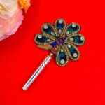 Natural peacock feathers mounted on a base covered with pure silver. It is believed that keeping peacock feathers at home brings good luck and prosperity into the house. The peacock feather is said to attract wealth and gives stability. Keep it near the locker. Peacock feather is also very effective in removing any sort of negative energies or vaastu dosh in the house. However make sure that dust should not be allowed to settle on top of the feather. It also brings Shri Krishnas blessings in the house. It brings protection and love in your house. These natural peacock feathers are collected without causing any cruelty to Peacocks. Keep it in the temple in your home or gift it to your loved ones to see them blessed.