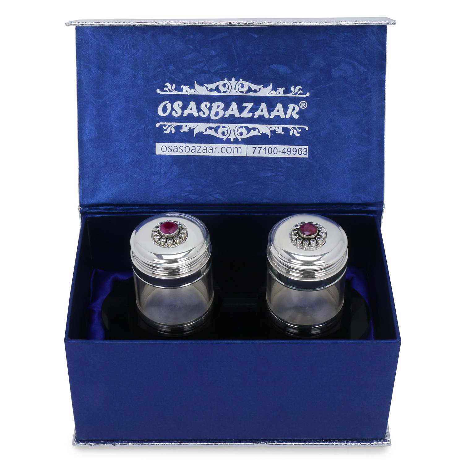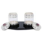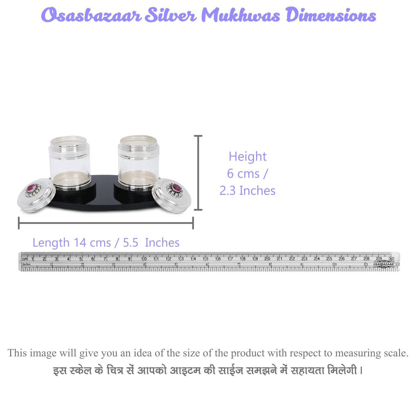 Length: 17.5 cm Width: 10 cms, Height: 8.5 cms. Capacity: 90 ml each container. Silver Weight: Approx. 40-44 gms. (Silver articles are handmade so, weight might differ). Check ‘Dimensions’ image.