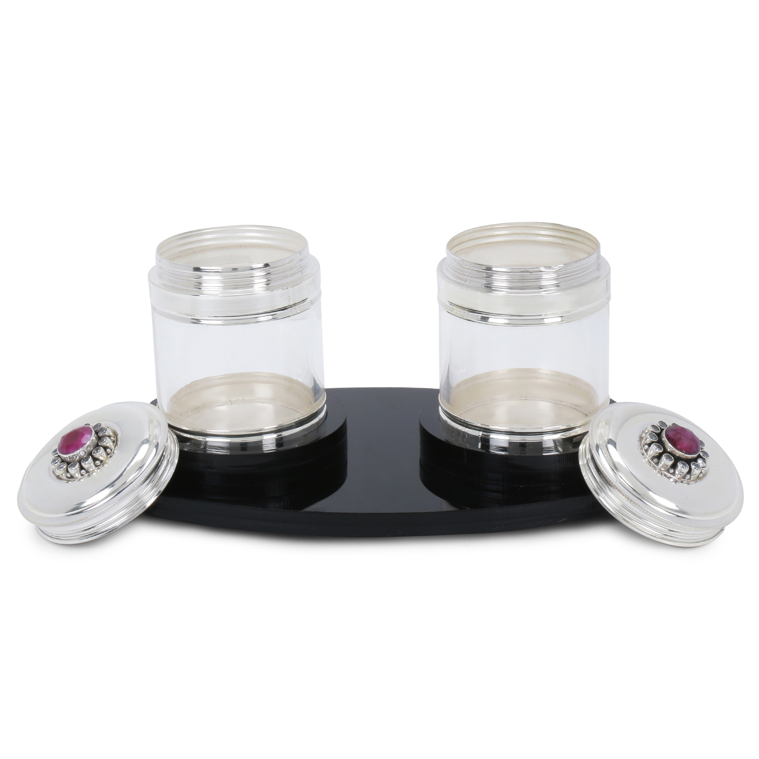 Two small silver boxes with excellent craftsmanship are perfectly placed on a dark acyclic base. The boxes are made of silver and glass with astonishing stone work on top of the lids and a charming glossy finish on the body.