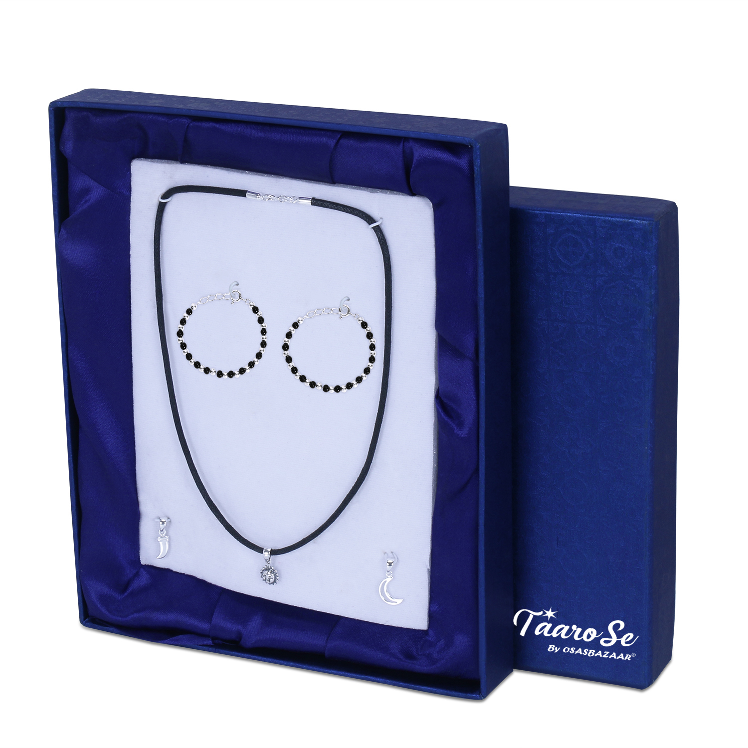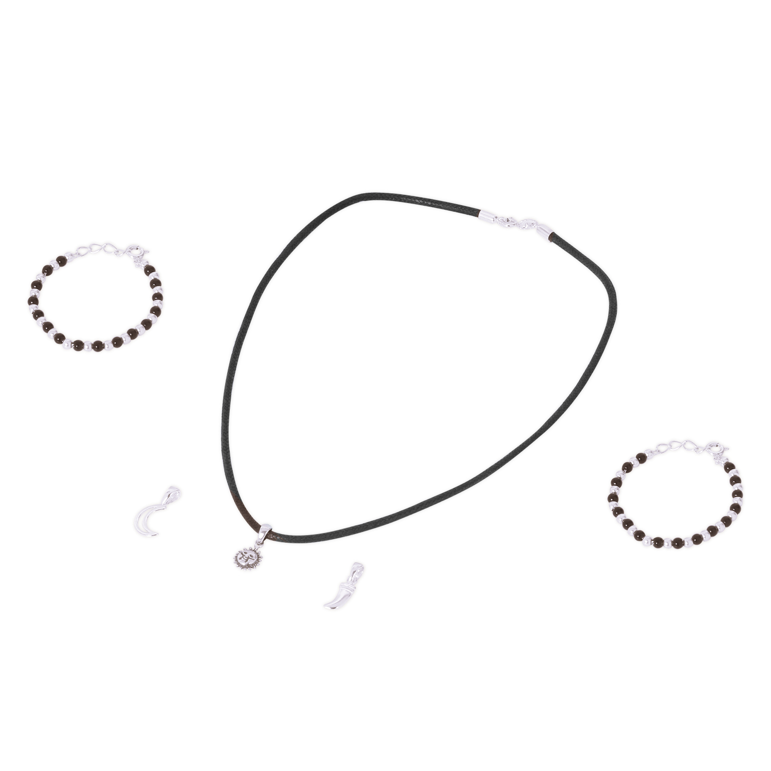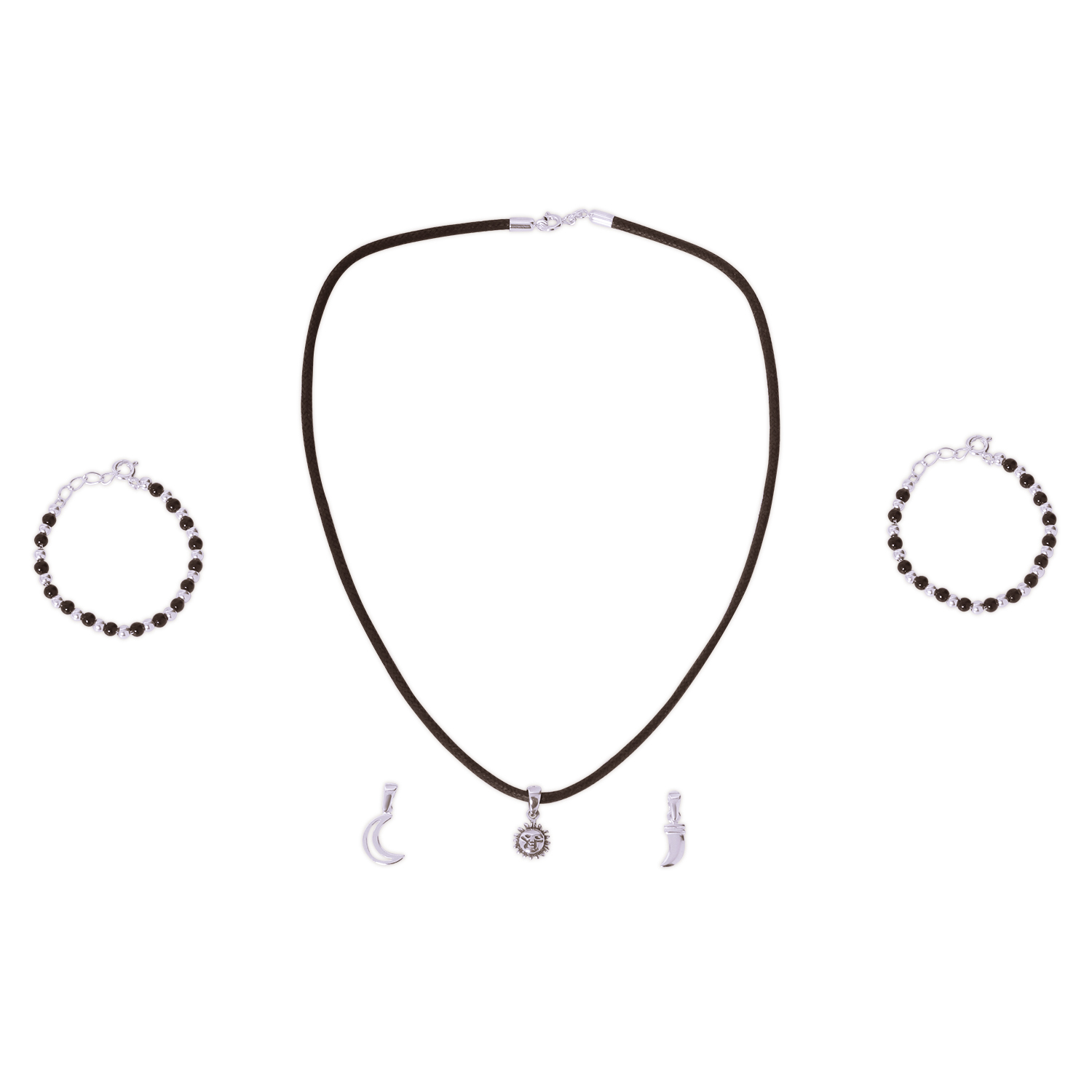 Evil Eye, Buri Nazar, Disti or Drusti is believed to be real around the world. Prevent it and protect your baby with this pendant set and silver nazariya pair. Silver is the purest and holiest of all metals and it spreads positive energy. The sun, moon and knife symbols are talismans that are meant to protect your child from evil spirits. It is a custom in India to wear this in black thread. The bracelet set is made of sterling silver beads and crystal black beads. Black beads protect from negative energies and bad influences. It protects from both intentional and unintentional buri nazar. A lot of care has been taken so that these pendants and nazariya are extremely comfortable for kids. A perfect gift for your new born baby.