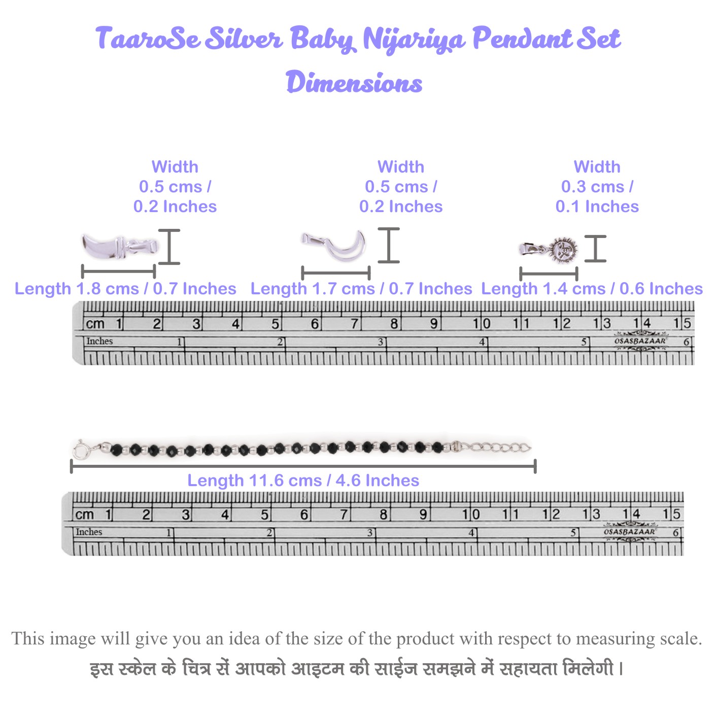 Pendants Length: Upto 1.8 cms, Width: Upto 0.5 cms. Nazariya Length: 11.6 cms. Total Silver Weight: Approx. 8-9 gms. (Silver articles are handmade so, weight might differ). Check ‘Dimensions’ image.