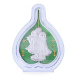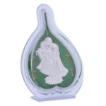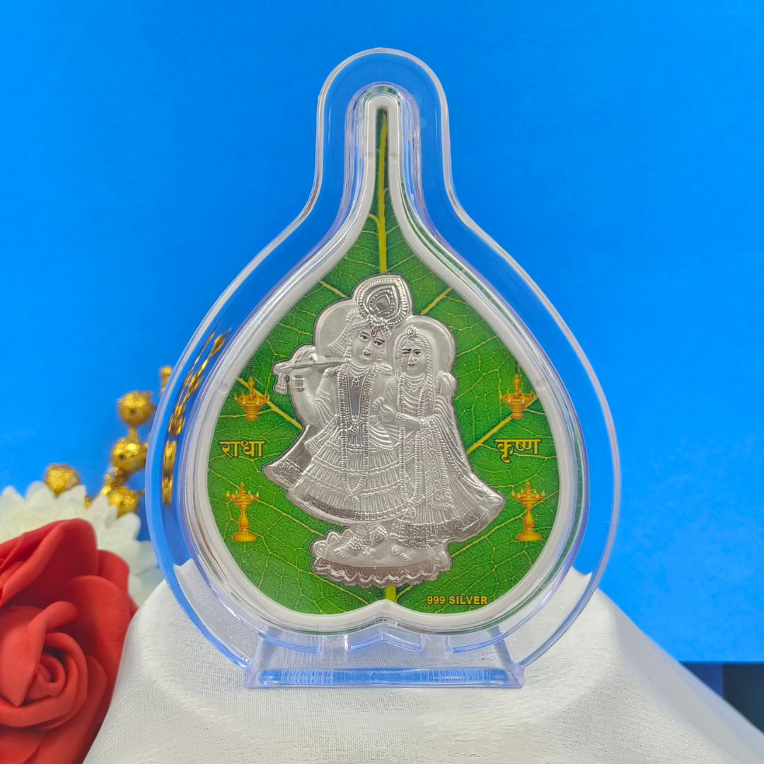 The product has a thin silver sheet with a picture of the Hindu gods Radha and Krishna engraved on it. This silver sheet is attached to a green paper leaf, and the whole thing is placed inside a clear acrylic photo frame. The combination of the silver sheet and green leaf makes it look beautiful and peaceful.