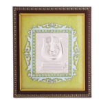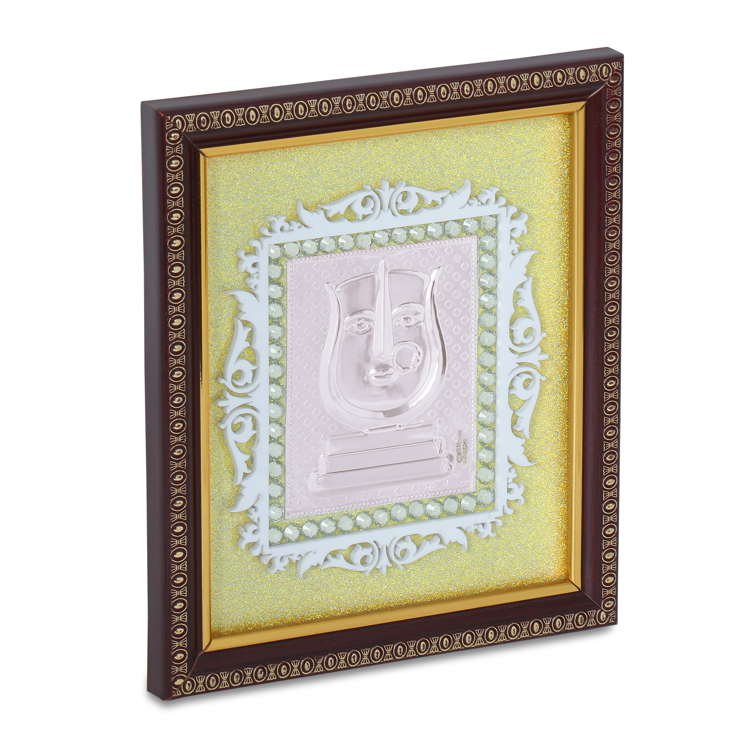 A beautiful image of your favorite Goddess on a pure silver sheet surrounded by beautiful diamonds. It has an elegant white floral border on a golden paper to give it a divine look. The wooden frame has clear acrylic front with golden borders which add more beauty to the whole frame. It has a hook attached for wall mounting.