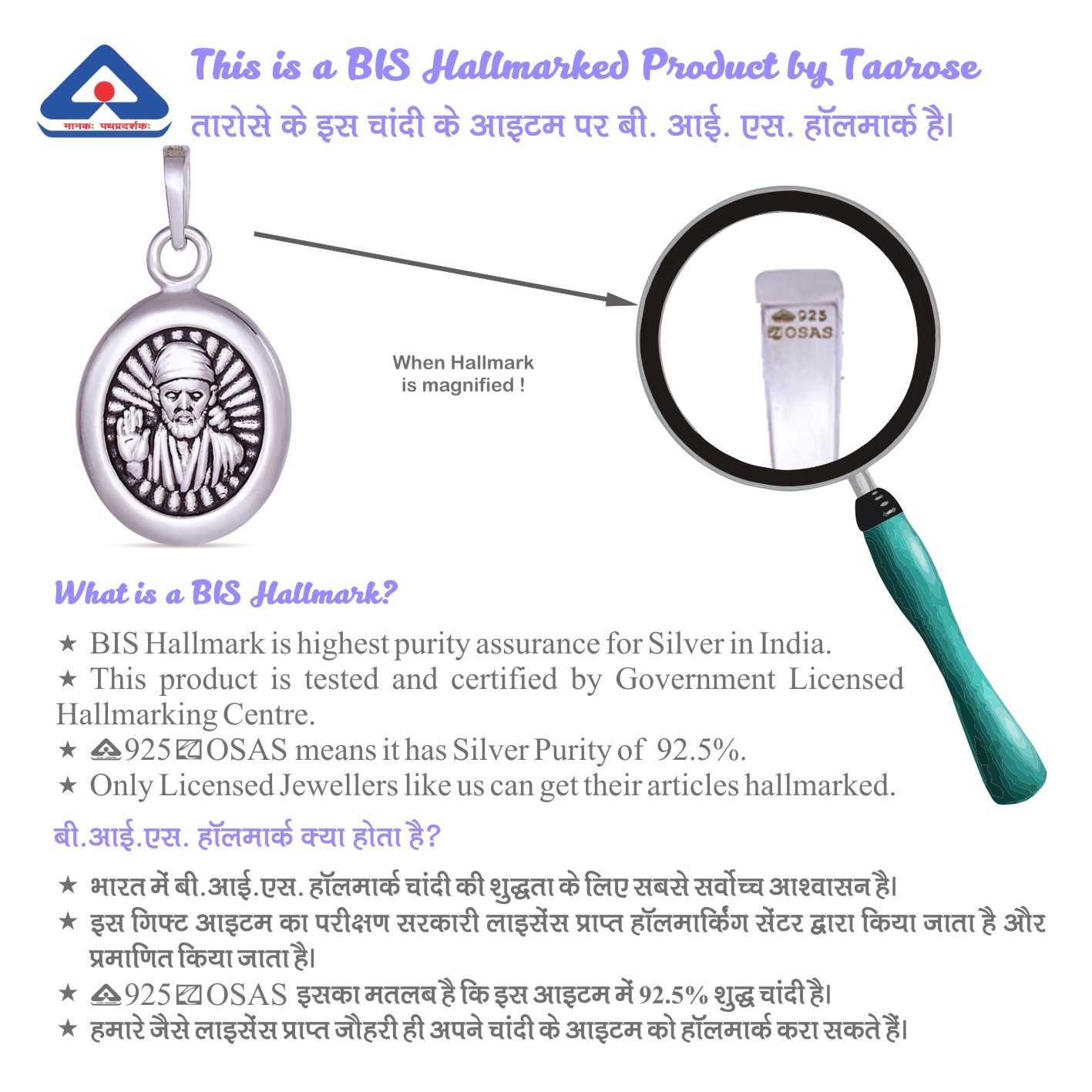 ♥ Material:  The Pendant and Chain are wholly made of Silver only. Silver Purity: 92.5%. A black thread is included in the box which has a non-silver metal clasp. Certification: BIS Hallmarked Item