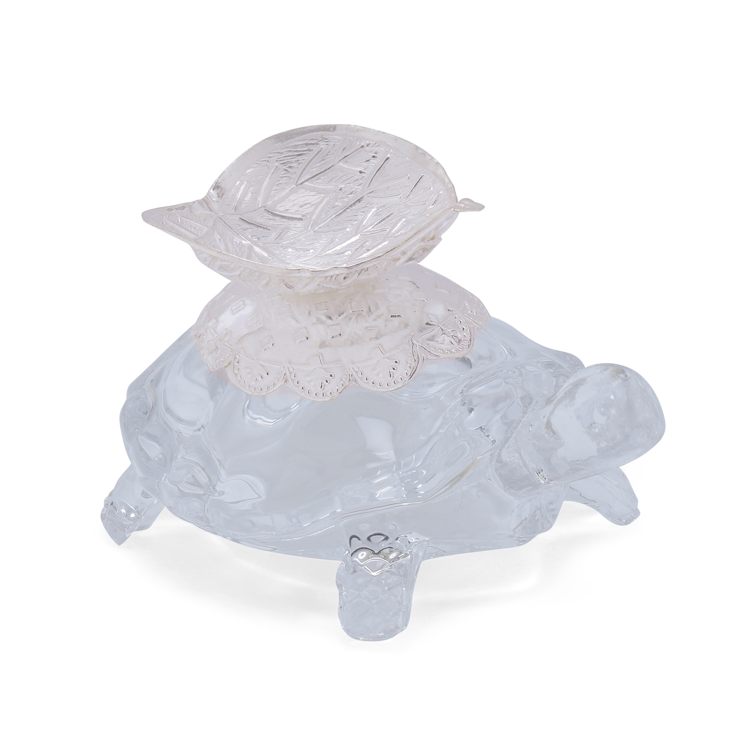 The diya is made of silver and stuck on top of a crystal tortoise. Silver Purity: 90%-92.5%.